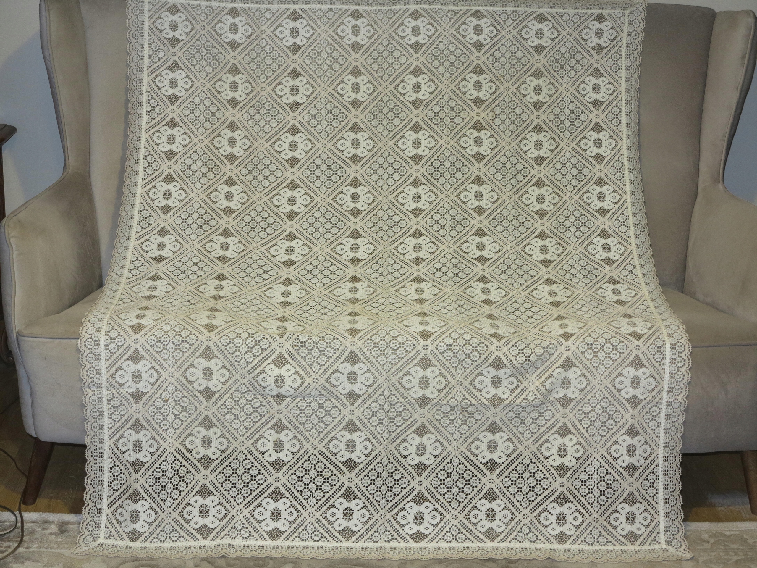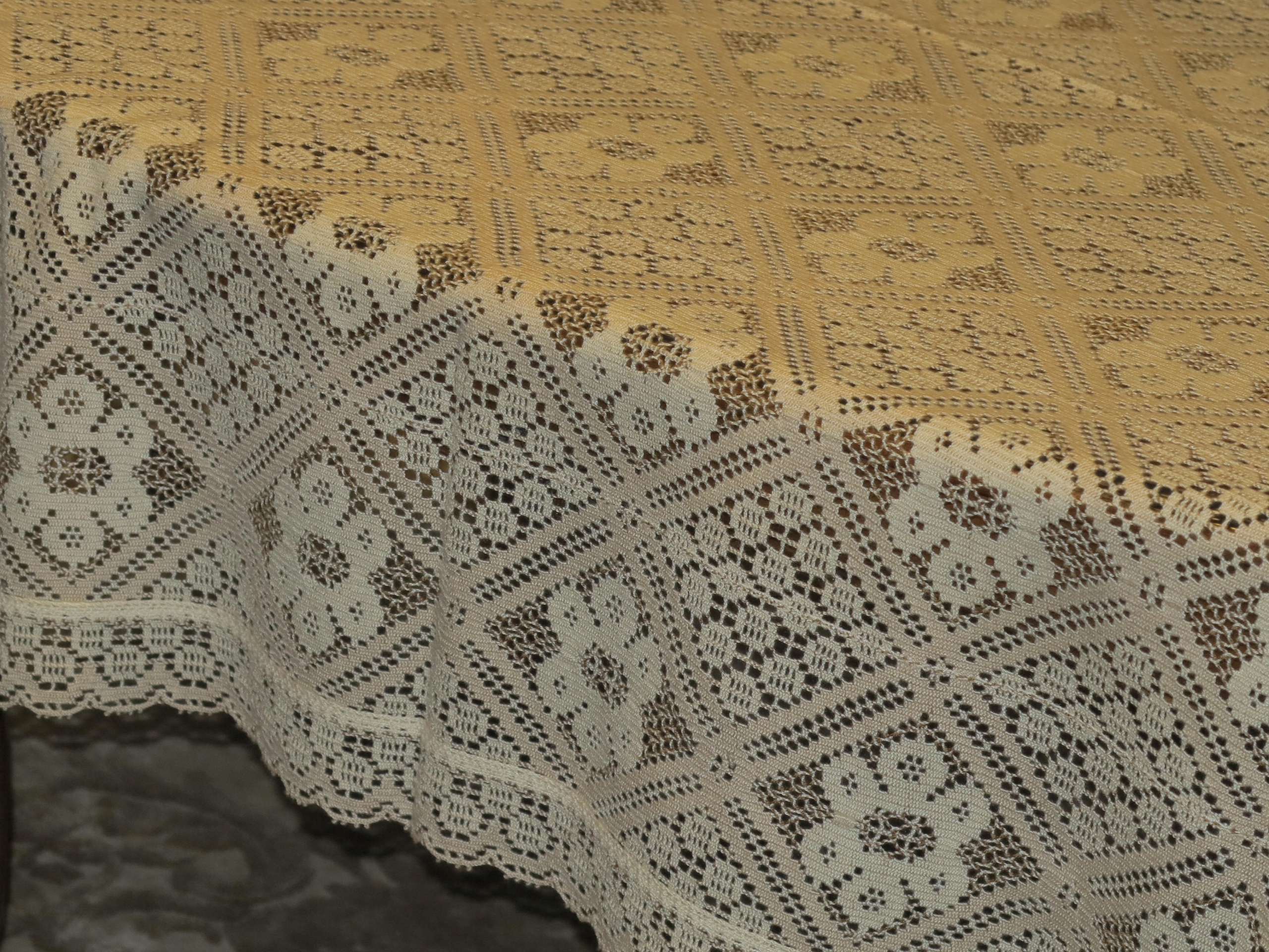 Прекрасна скатертина, виготовлена з товстого і дуже міцного машинного синдрічного мережива. Приблизно за густе мереживо. Бежеві скатертини