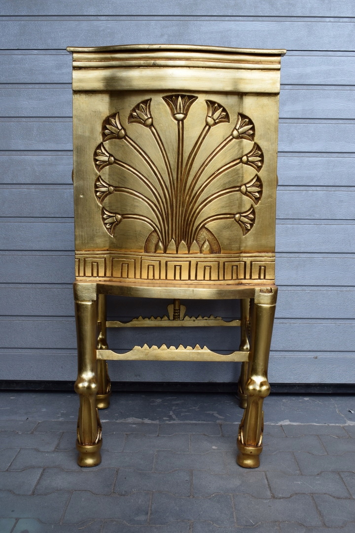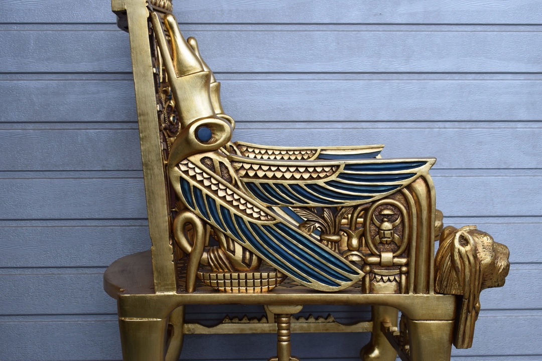 Натхненний стародавнім Єгиптом, це крісло було створено з урахуванням найвибагливіших клієнтів. Виготовлена з деревини найвищої якості, покрита хитромудрою позолотою, вона приваблює погляд і радує своєю формою. Орнаменти відсилають до королівських символів, що надає йому унікального характеру.