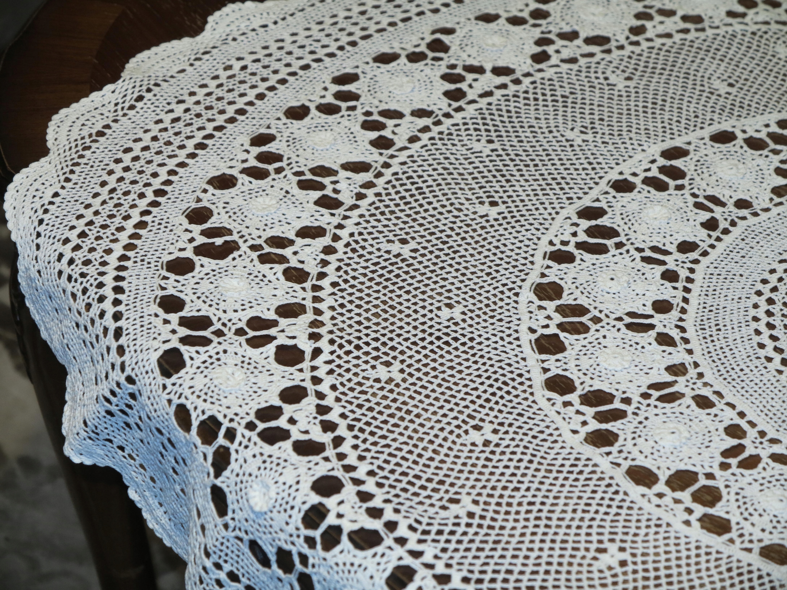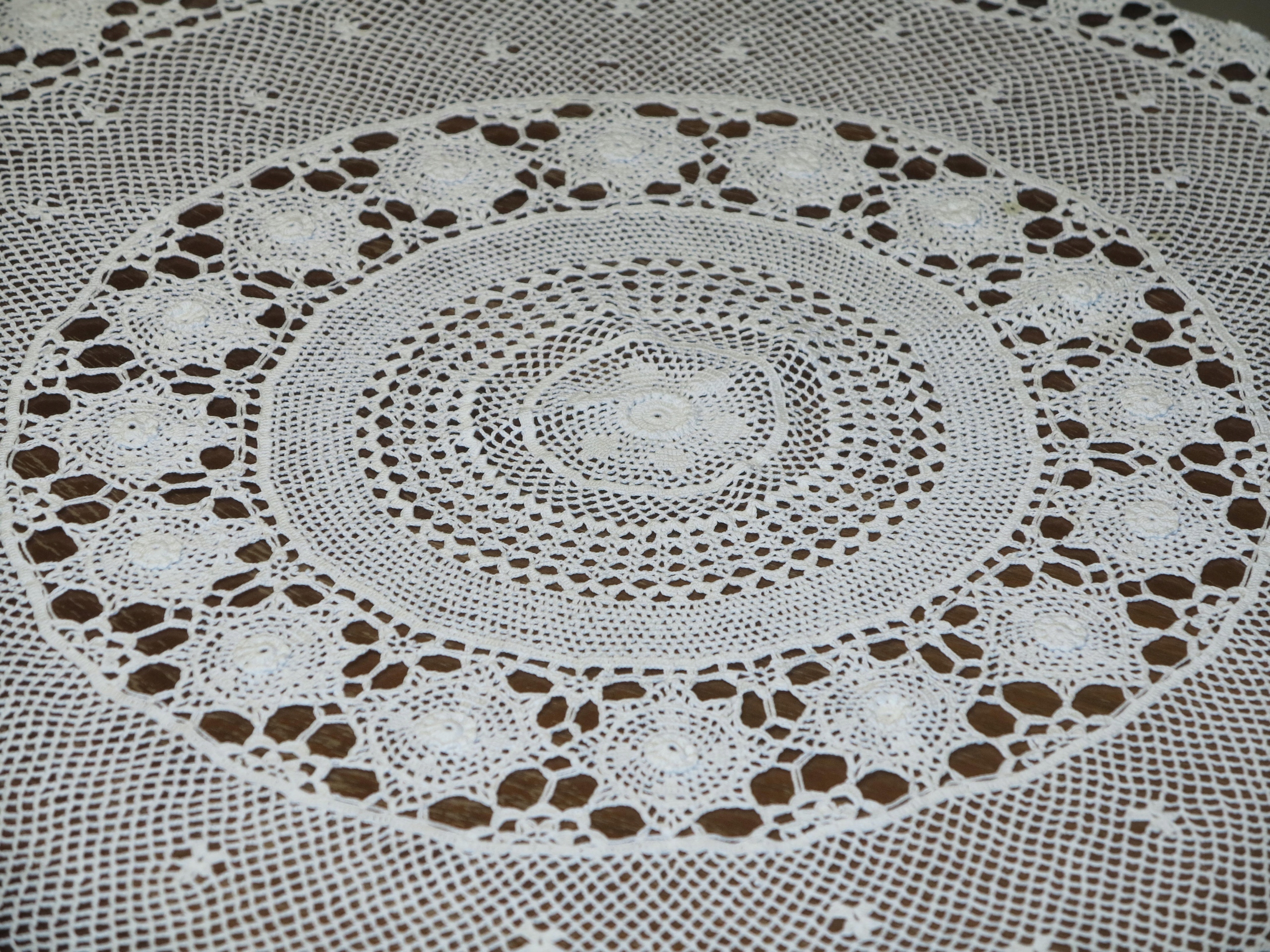 Тема аукціону - це надзвичайно красива, кордонна скатертина з дуже декоративним малюнком, білим. Має розміри: Діаметр: 102 см. Використовувана скатертина, в супер хорошому стані та якості. Я рекомендую