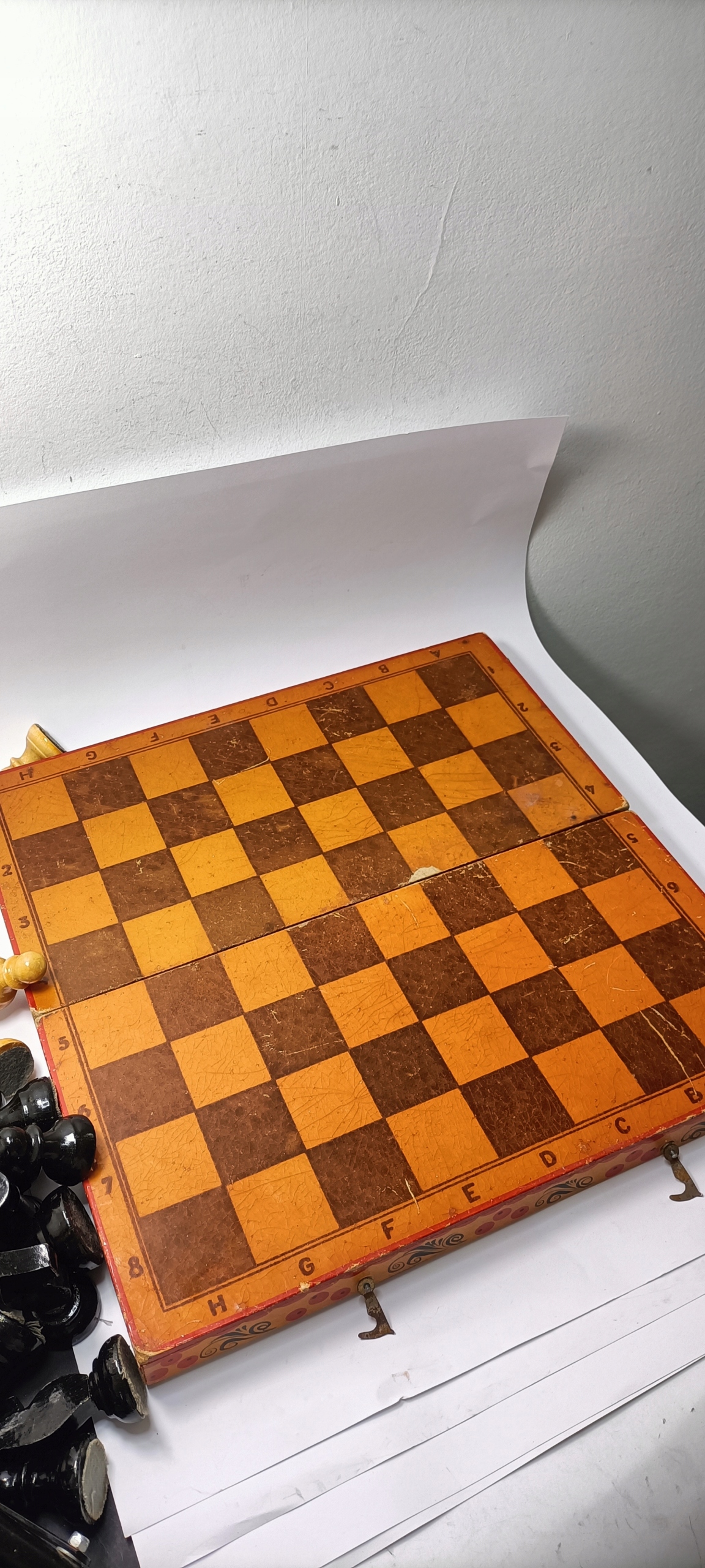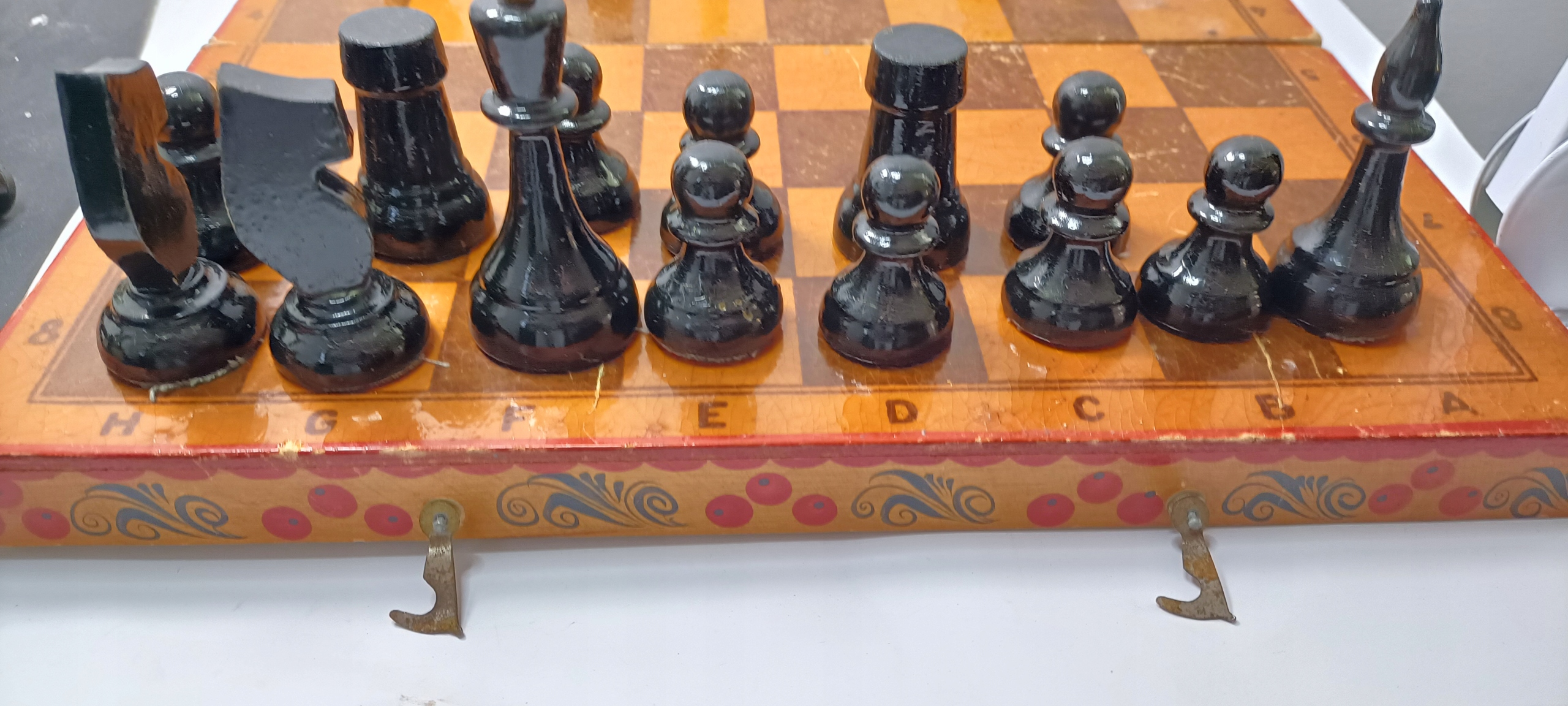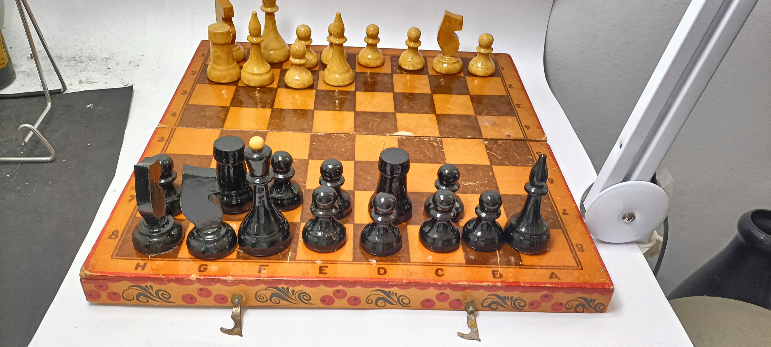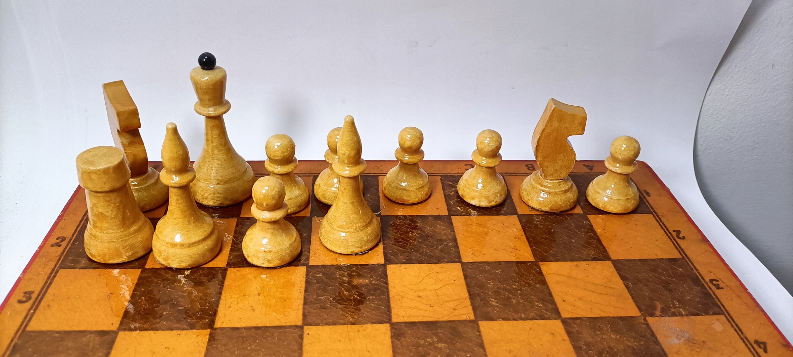 Красиві старі дерев'яні шахові фігури, народний дизайн часів Польської Народної Республіки