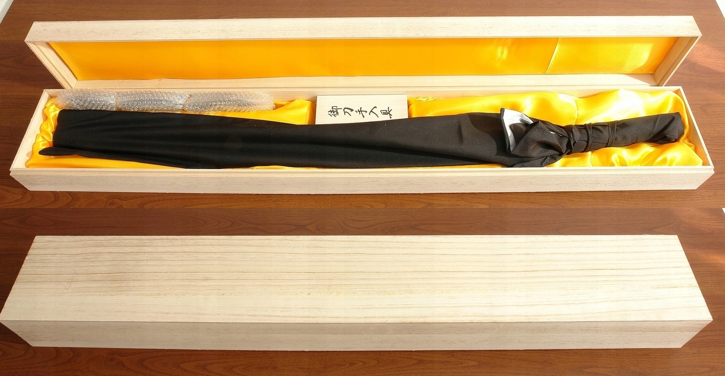 Самурай Катана, вирізаний вручну від T10 -вуглецевої сталі з справжнім Хамоном. Меч-новий, невикористаний, в ексклюзивній дерев’яній упаковці, з набором технічного обслуговування меча, кришкою, мечами