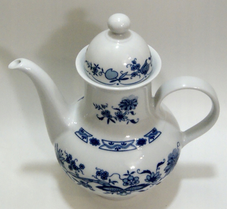 Глечик виготовлено з білої порцеляни, прикрашеної кобальтово-блакитним візерунком цибулі.