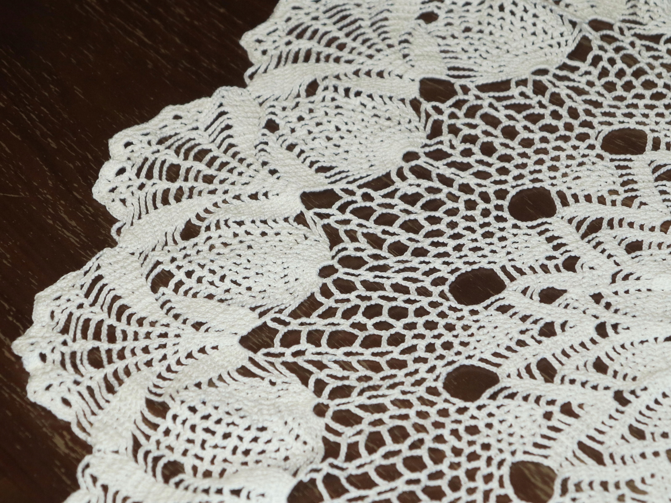 розміри: з дуже декоративним малюнком, у білому кольорі. Має розміри: Діаметр: 72 см. Використовувана скатертина, в супер хорошому стані та якості. Я рекомендую