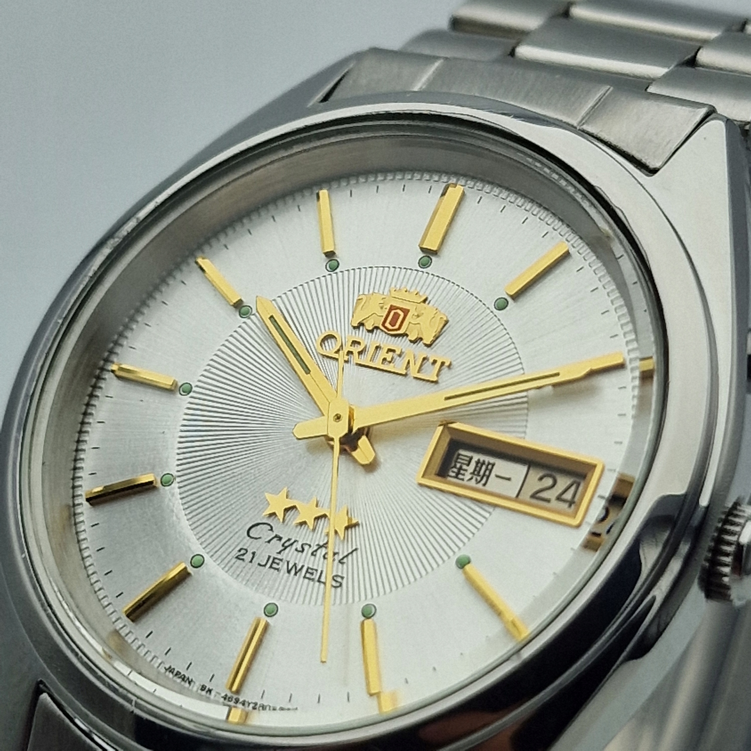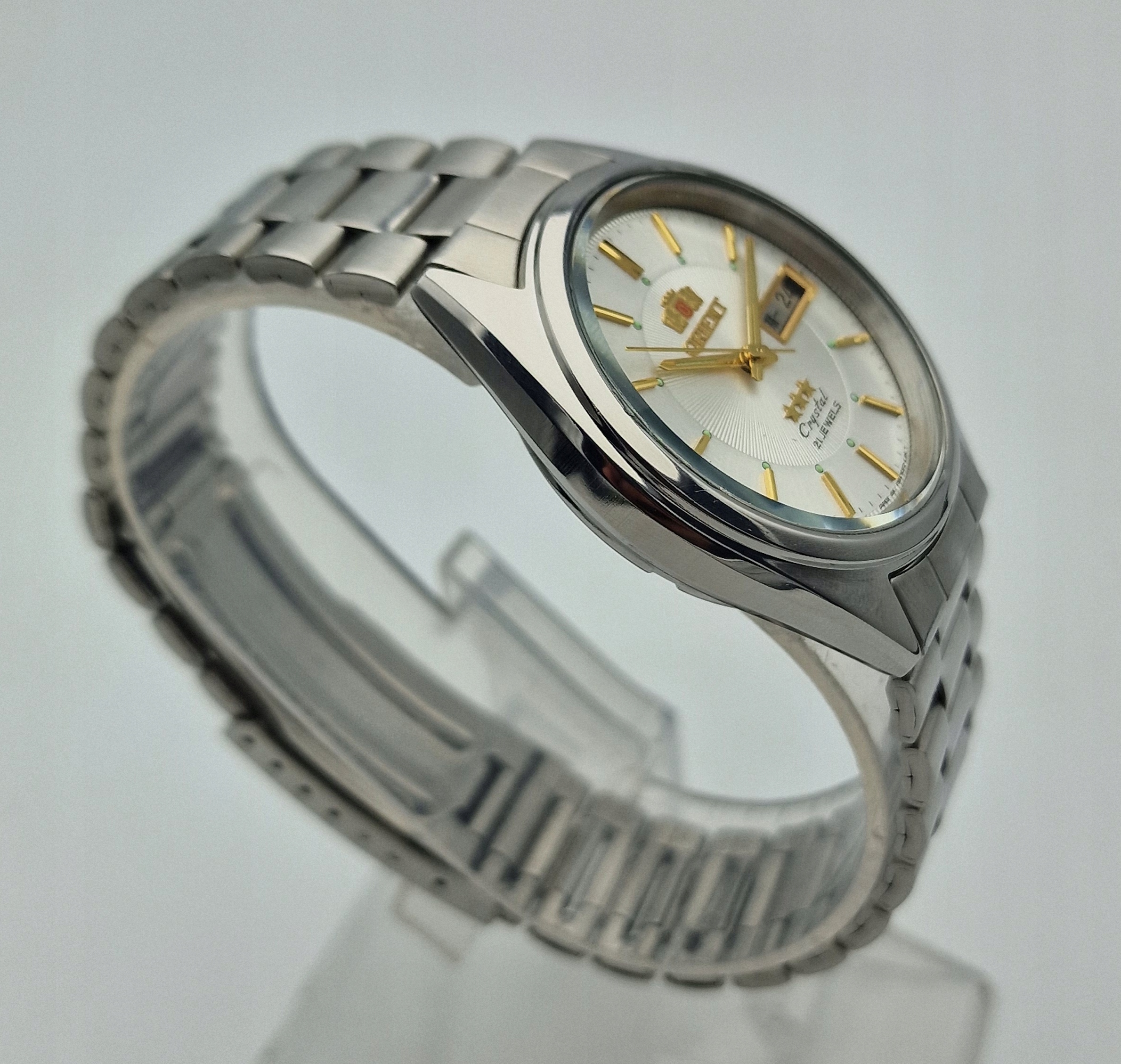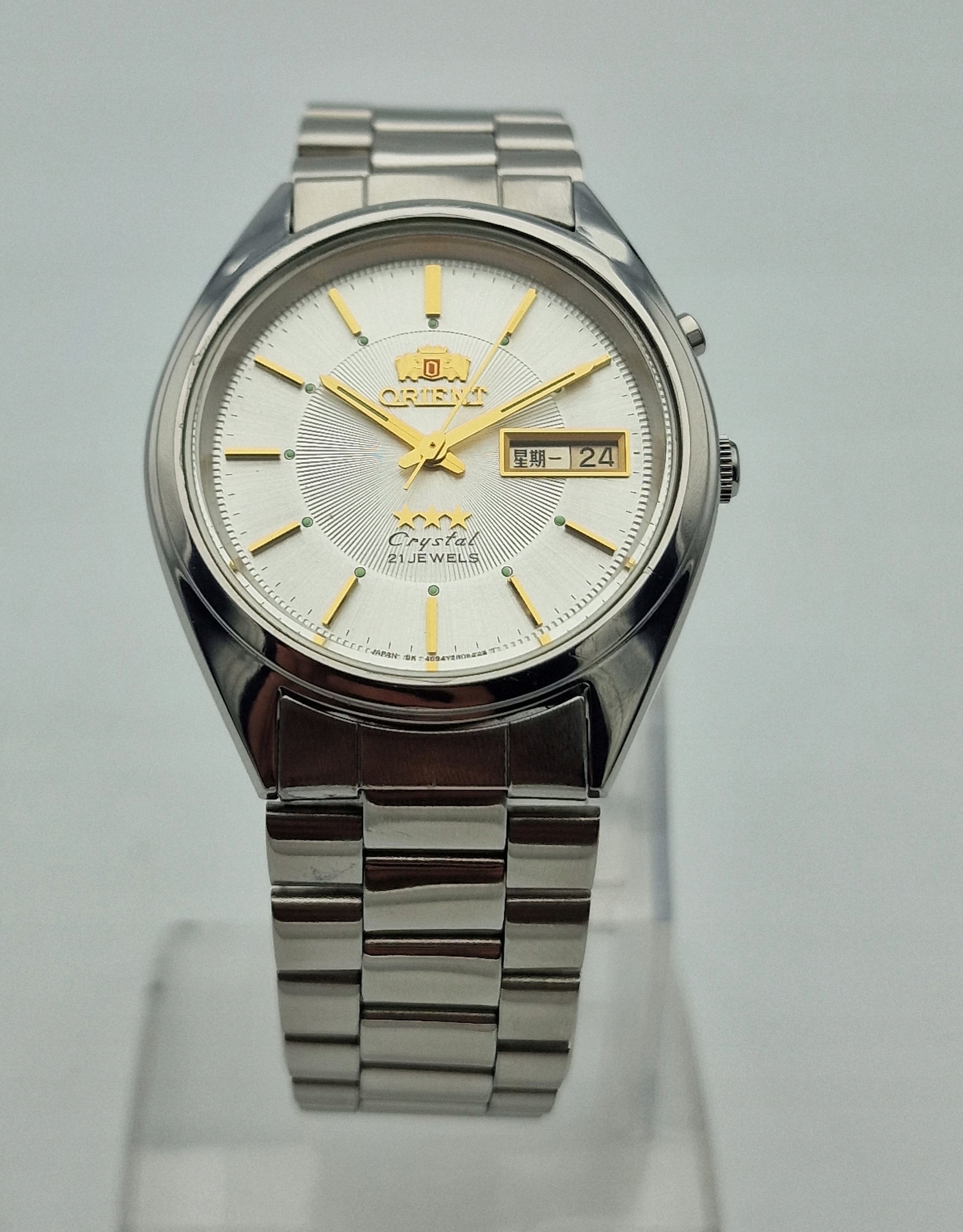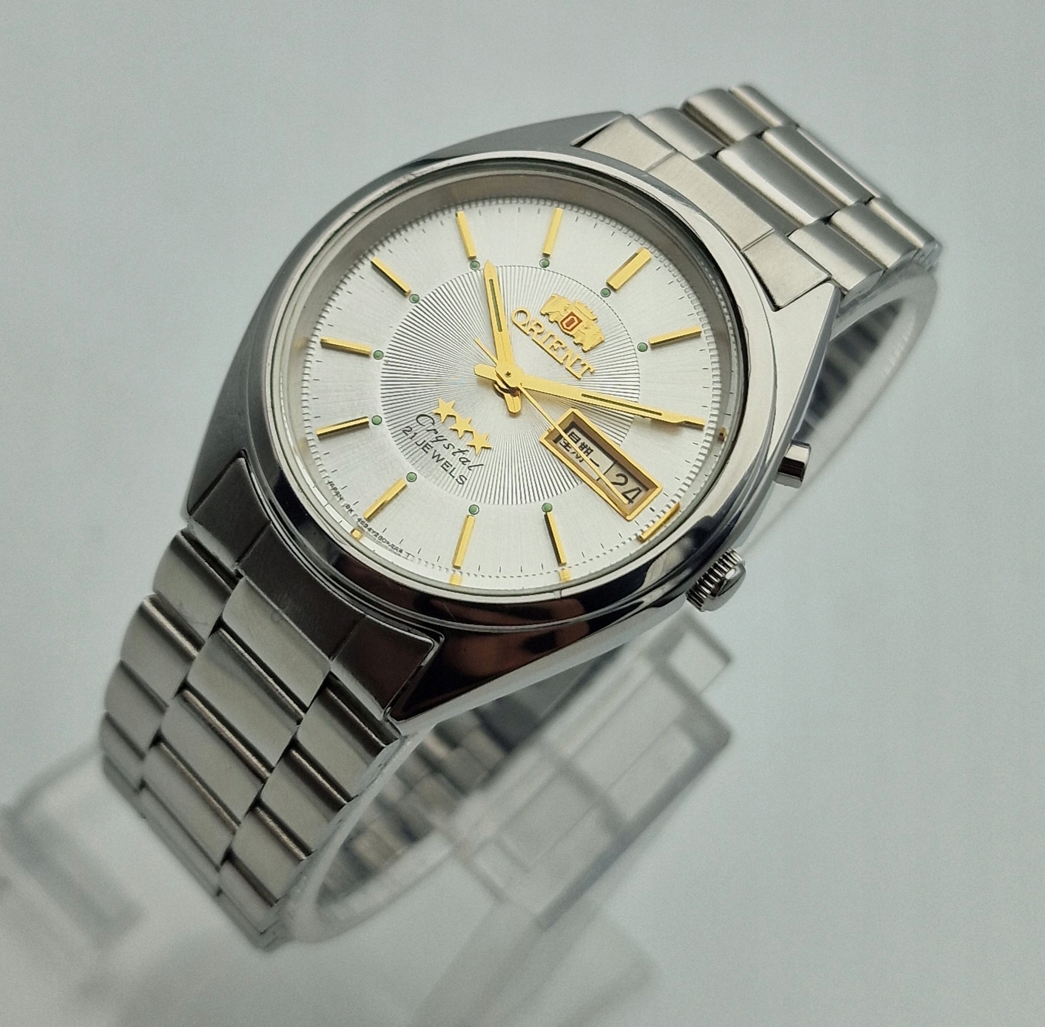 - Срібний металевий диск з календарем о третій годині. Підписаний щит: " Орієнт, 21 коштовності, кристал, Японія ". Щит у ідеальному стані, який представлений фотографіями аукціону.