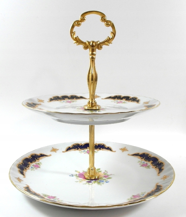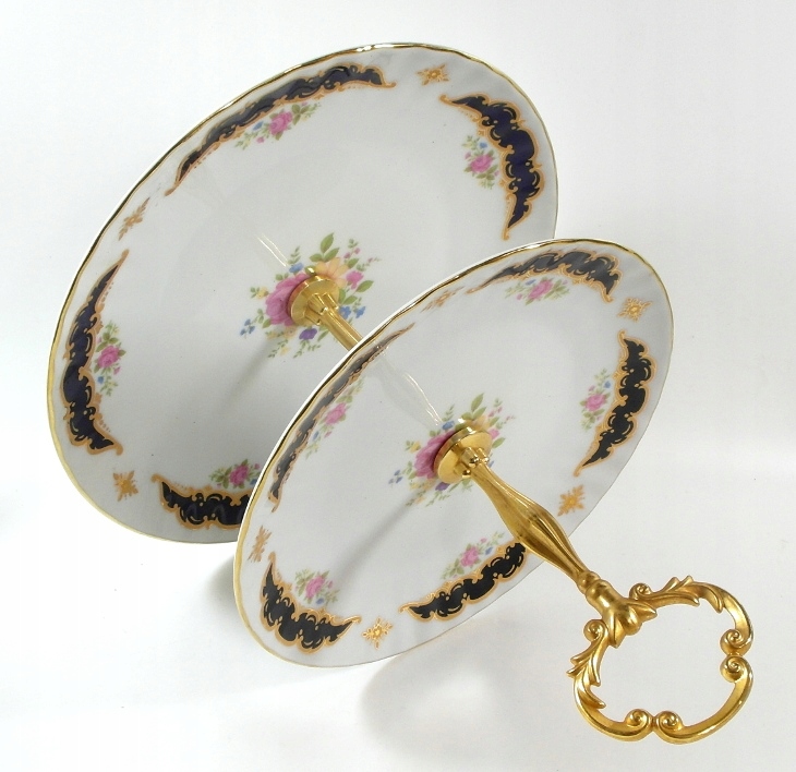 Предметом аукціону є гарна стара підставка для торта, виготовлена з білої порцеляни, прикрашена кобальтом, квітами та золотом, зі старою металевою ручкою.