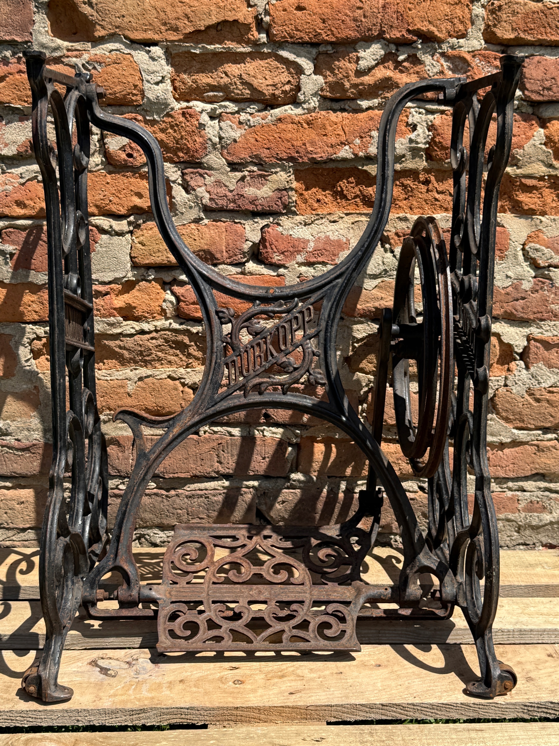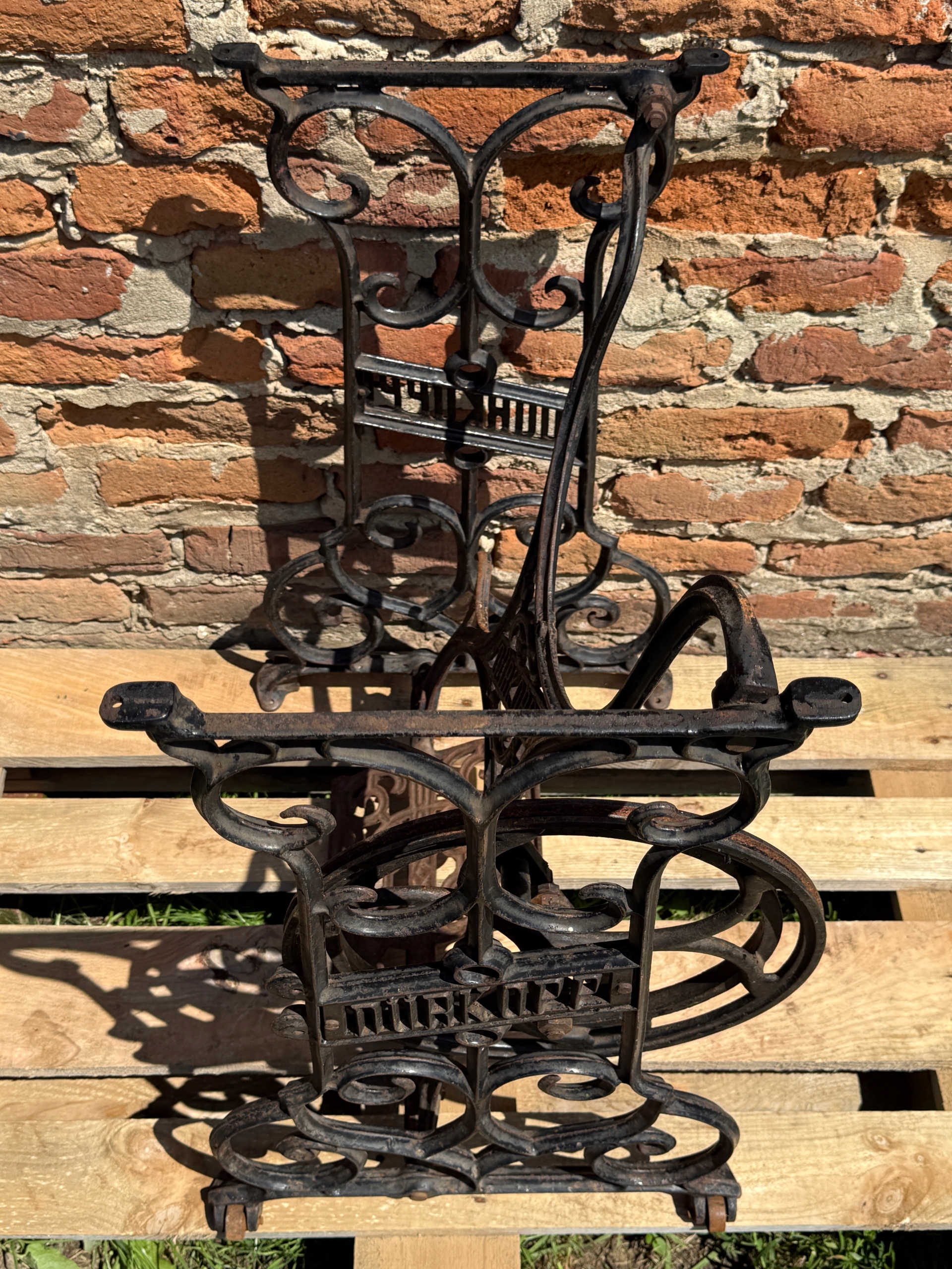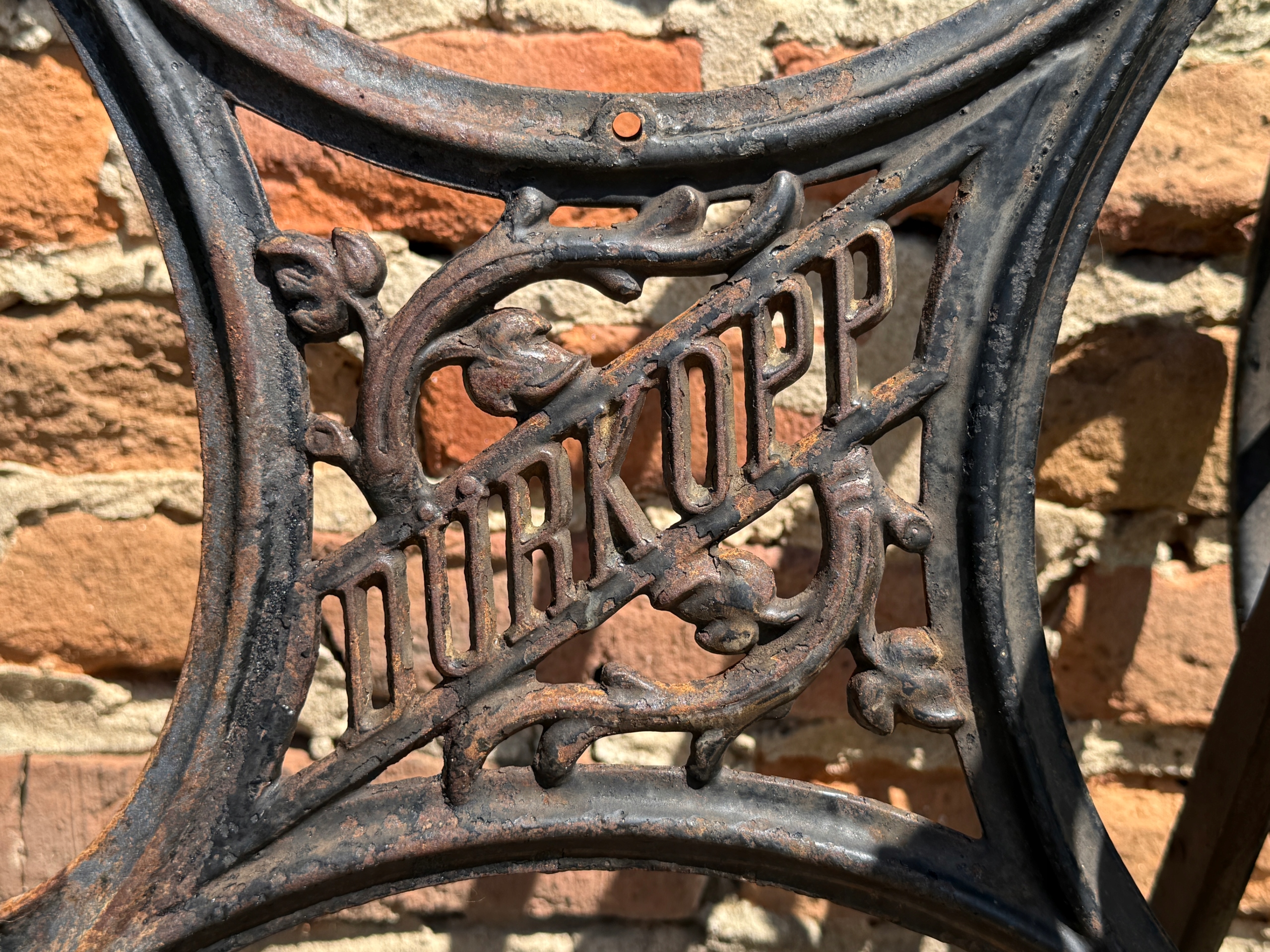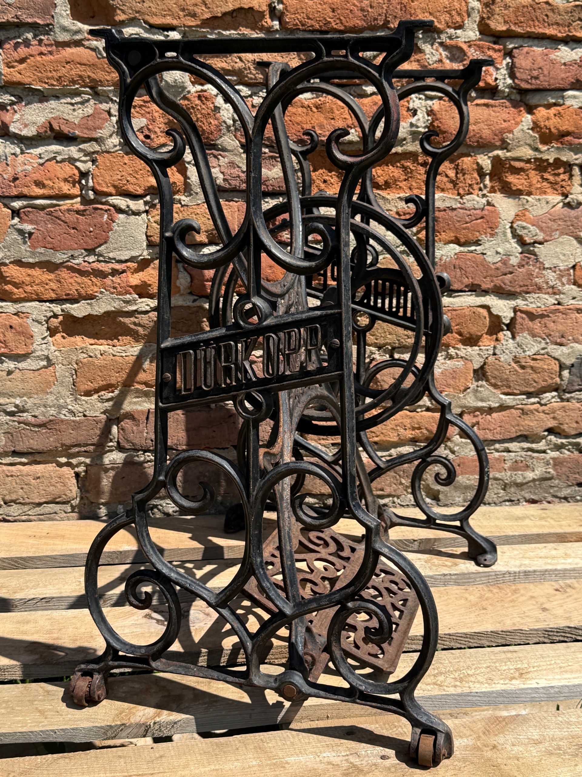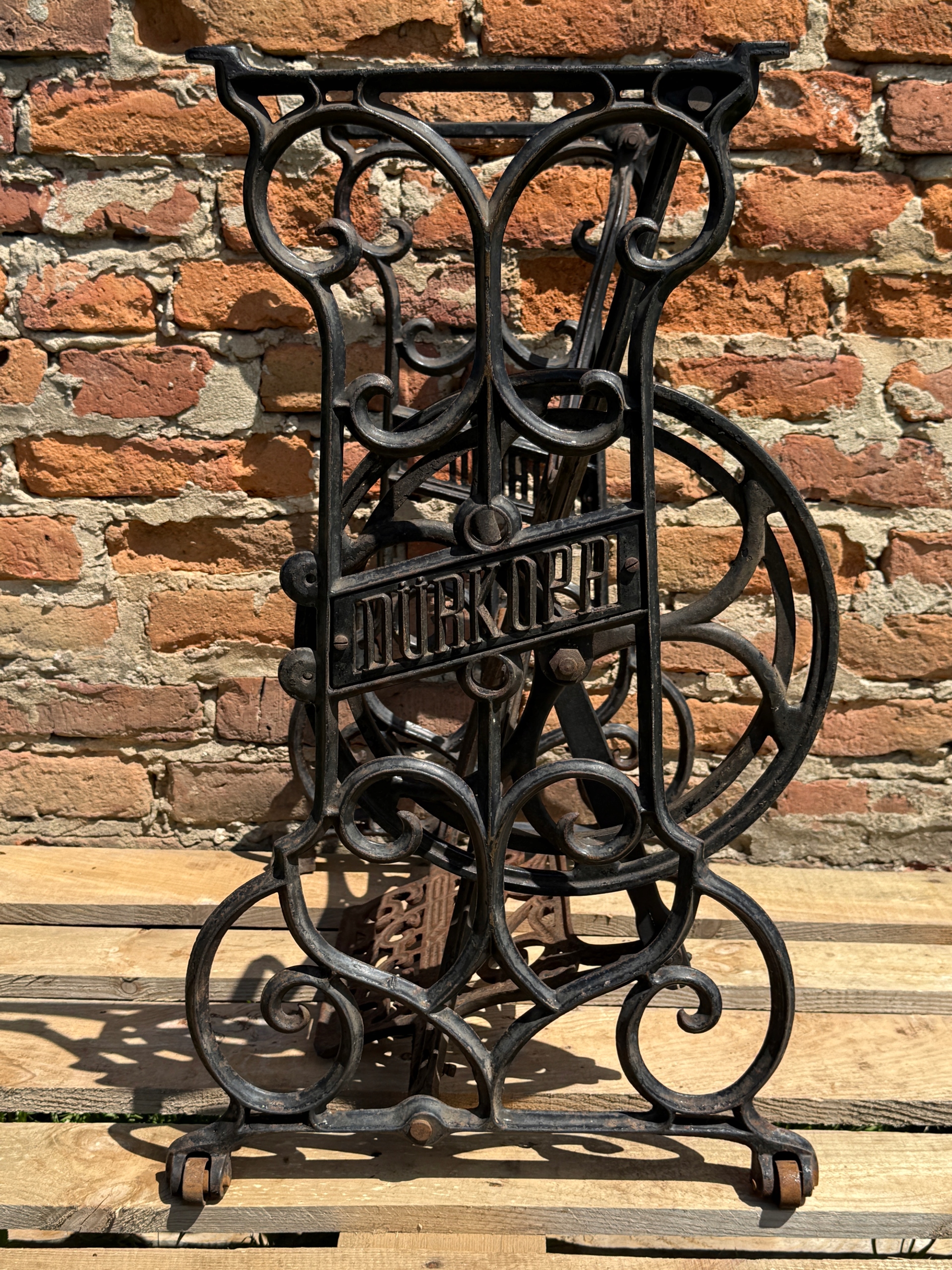 Предмет продажу стара чавунна основа від швейної машинки DURKOPP. Дуже гарний візерунок, гарно оформлений – зустрічається рідше. З боків і посередині є напис з логотипом компанії. У нього всі 4 колеса внизу. Базу з таким багатим оздобленням знайти все важче.