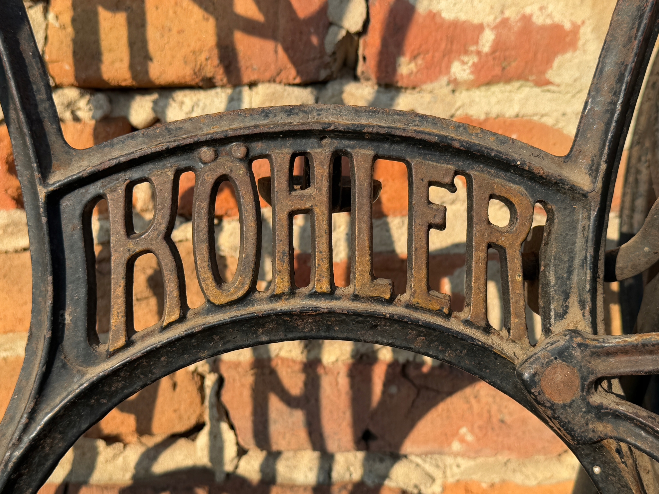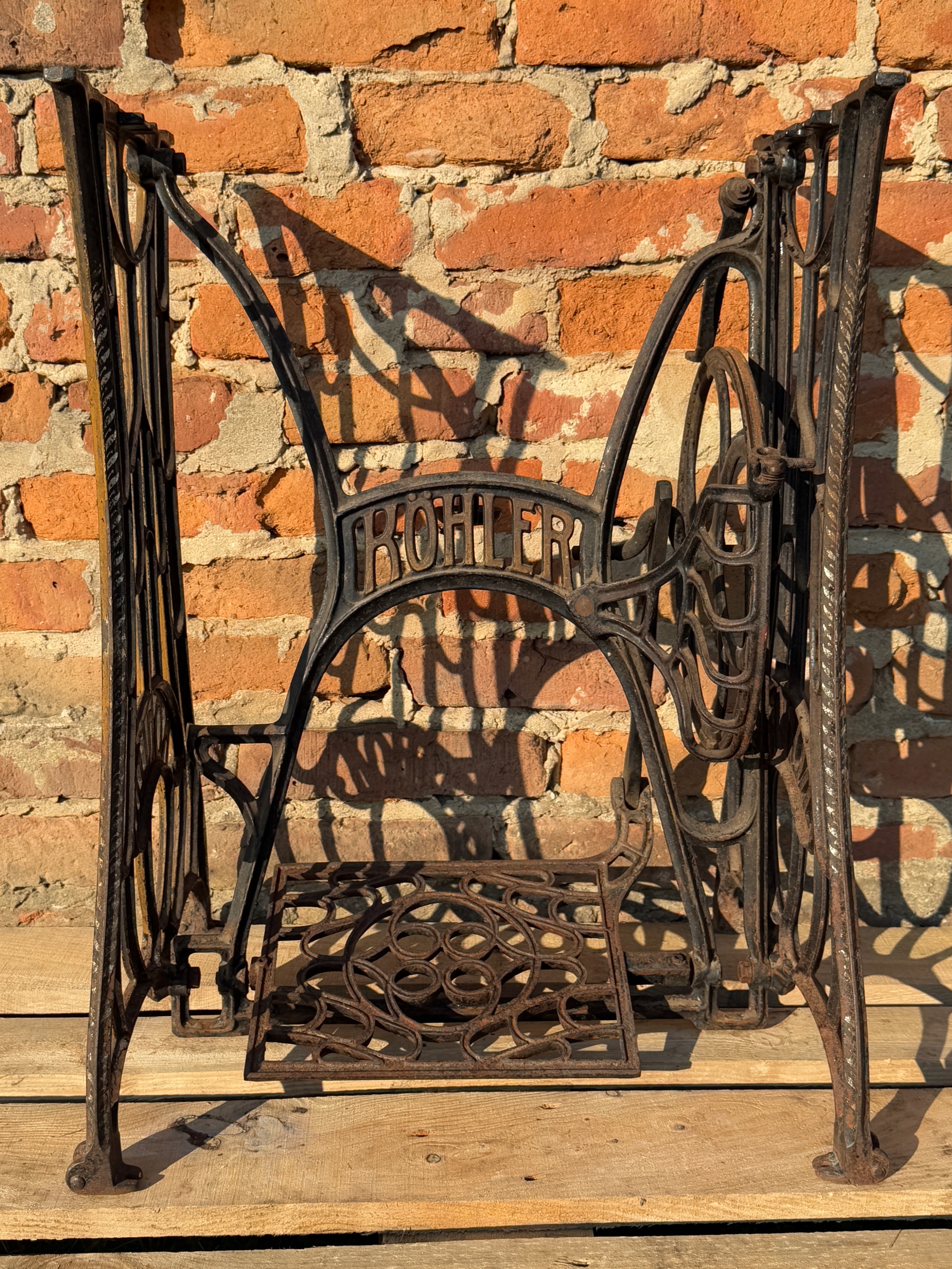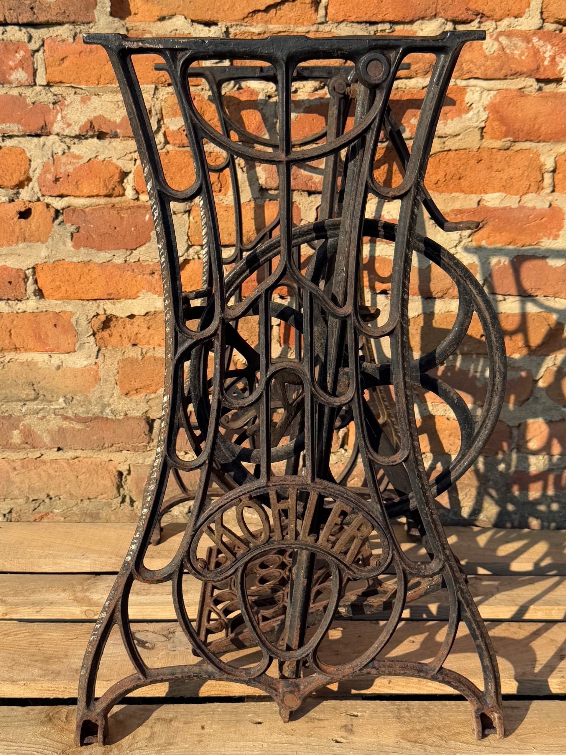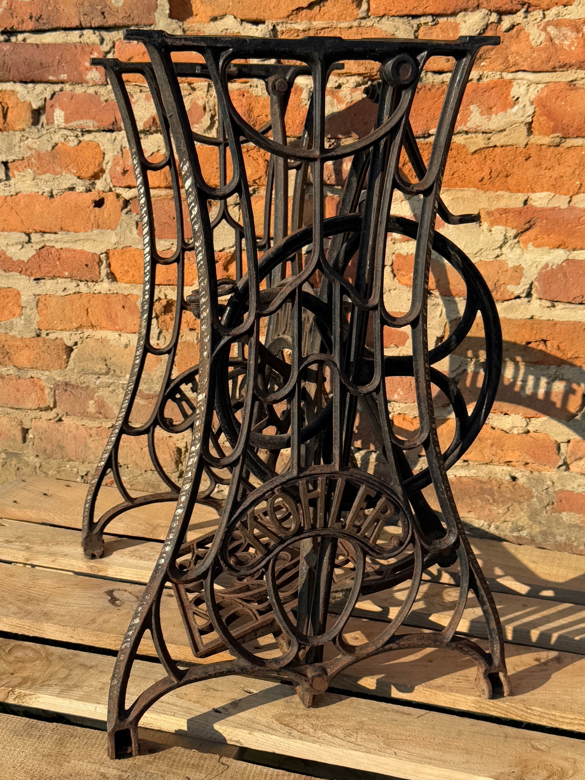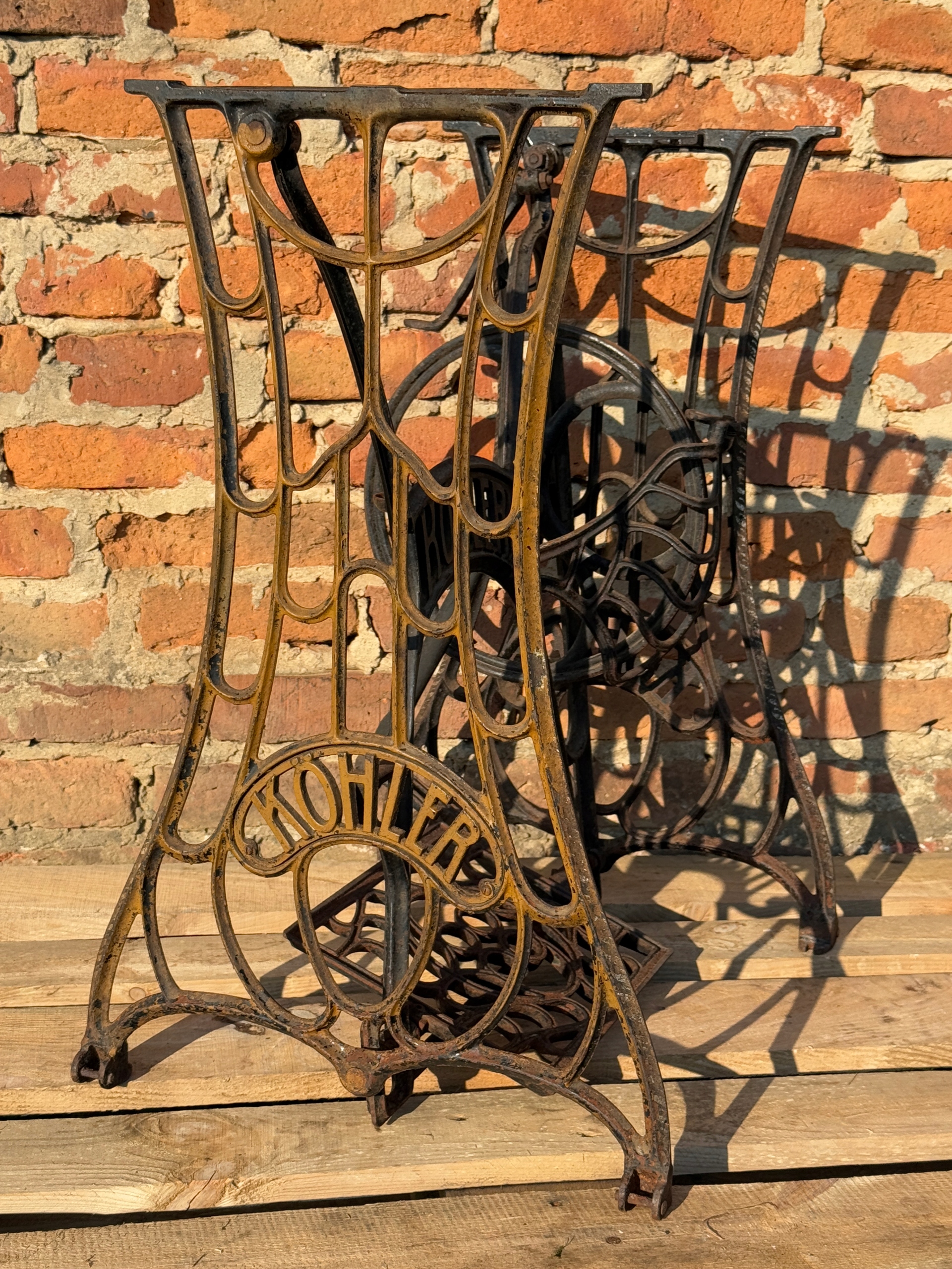 Тема продажу - це стара чавунна основа з швейної машини Kohler. Дуже приємний малюнок. У середній частині субтитри з логотипом компанії. Колеса, розташовані в нижній частині, були зняті так, що таблиця буде більш стабільною, вона не рухається.