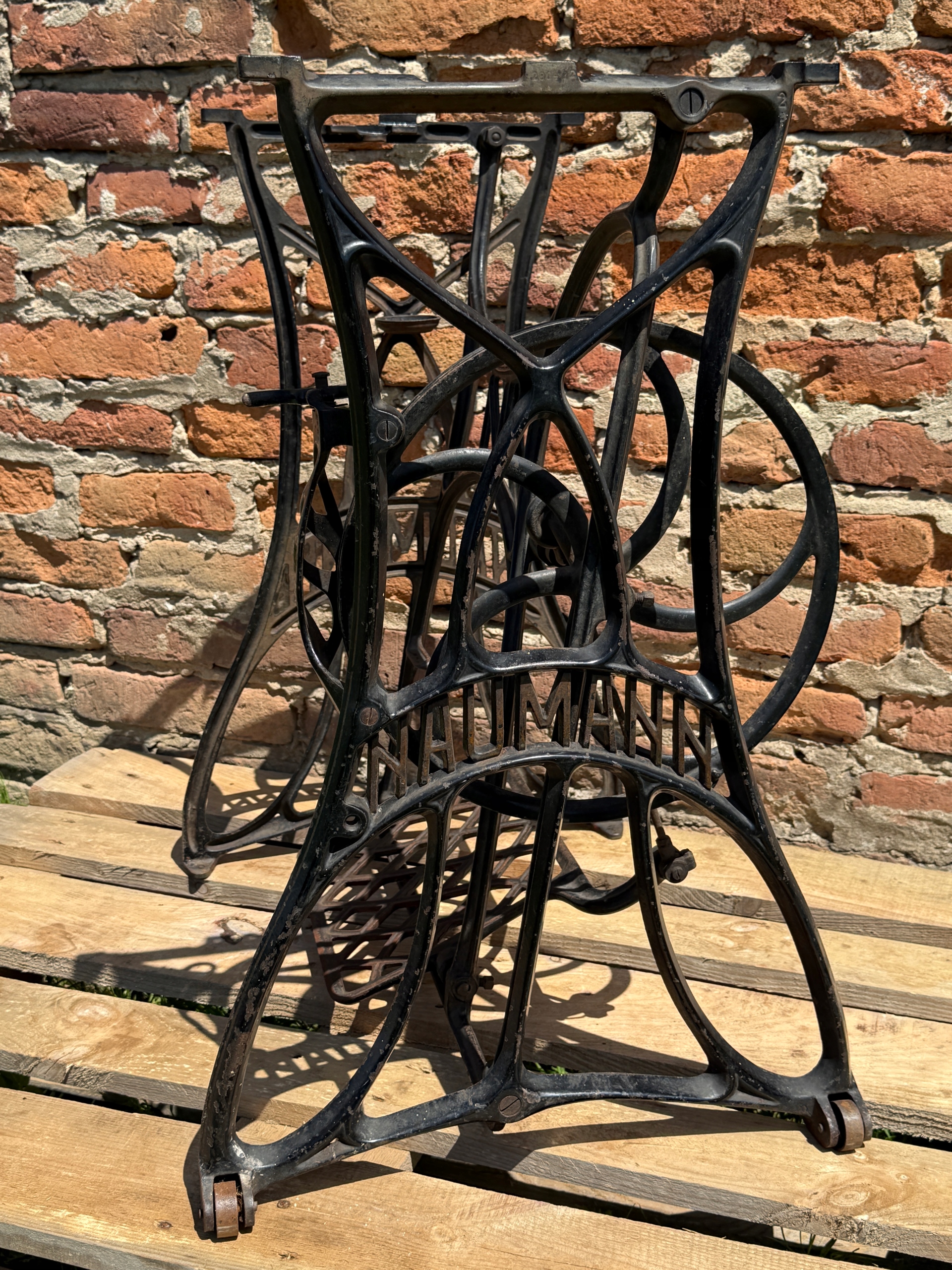 Тема продажу - це стара чавунна основа з швейної машини Naumann. Дуже приємний малюнок. Написи з логотипом компанії з боків. Він має обидва колеса в нижній частині ..