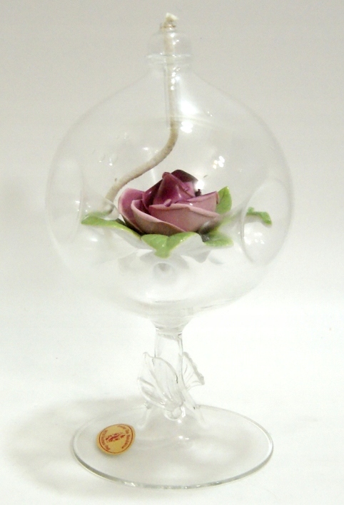 Красива стара лампа для ароматичних олій. Кришталеве скло, безбарвне, з клеймом, порцелянова троянда також з клеймом.