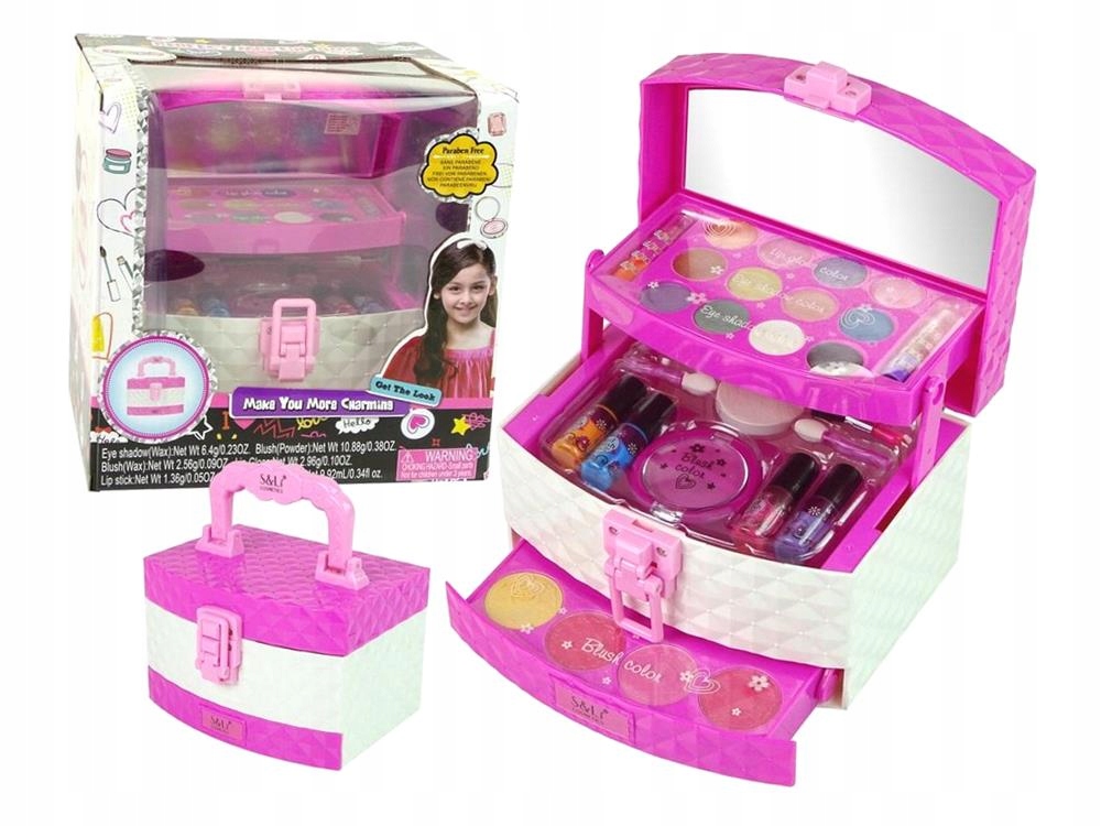 Запропонований набір, безумовно, порадує кожній маленькій леді і дозволить вам зробити цікавий макіяж та стиль. Ціле - прекрасний косметолог, закритий пряжкою. Сам багажник дуже елегантний і цікаво зроблений. Рожеві та білі кольори вміститься в будь -який інтер’єр, особливо дитяча кімната. Ящики висуваються, кожен приховує унікальні речі. На кришці є дзеркало, щоб вона могла легко взяти шкатулку з собою і малювати де завгодно. Ідеальний набір для невеликої подорожі.