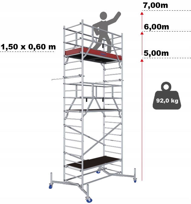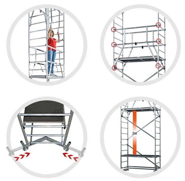- ✅Сертифікат TÜV, навантаження 200 кг/м², навантаження до 180 кг (навантаження на поверхню) відповідно до нового стандарту PN EN 1004-01 , група риштувань 3
