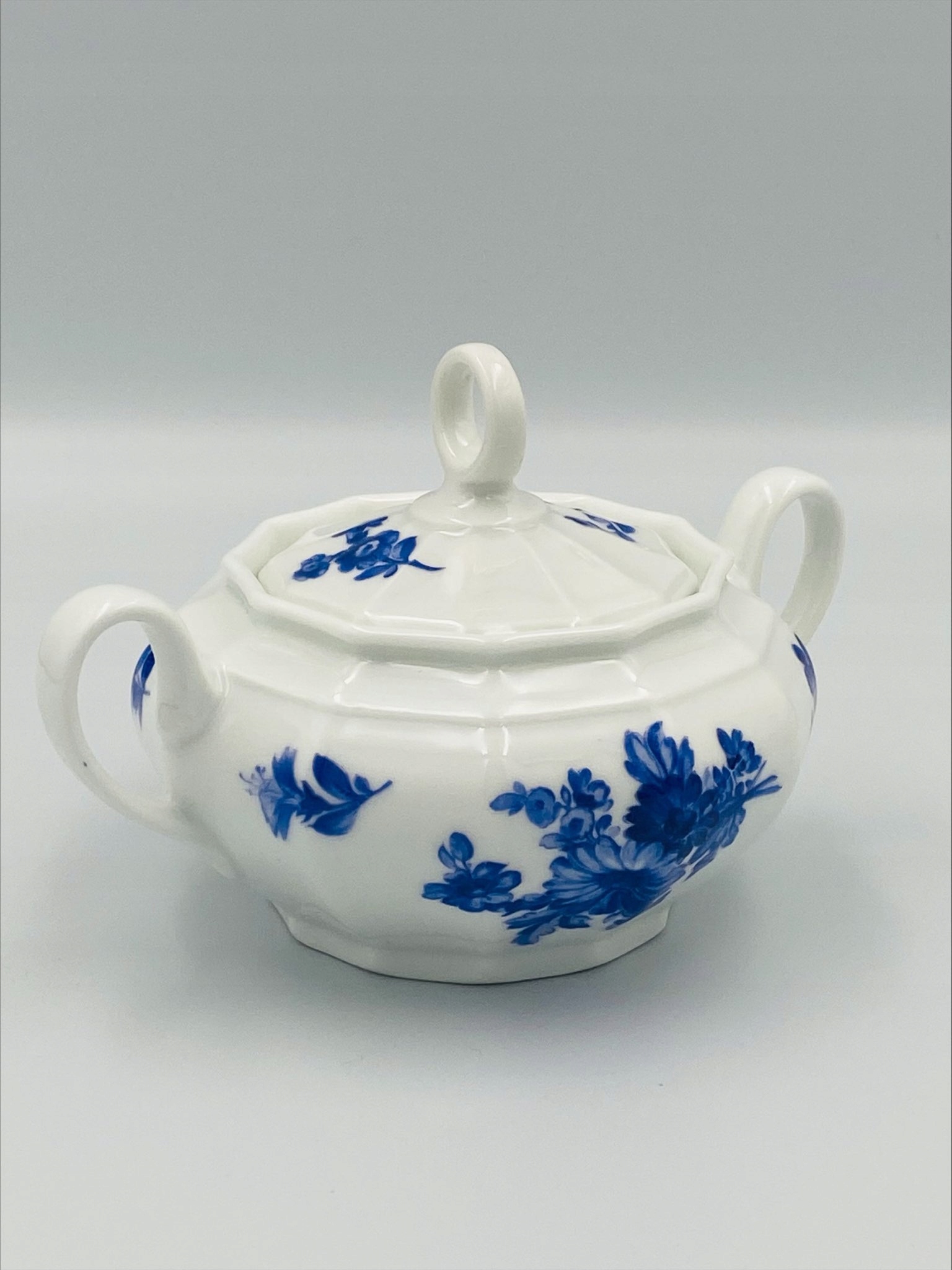 Біла порцеляна з квітковим, сапфіровим розписом.