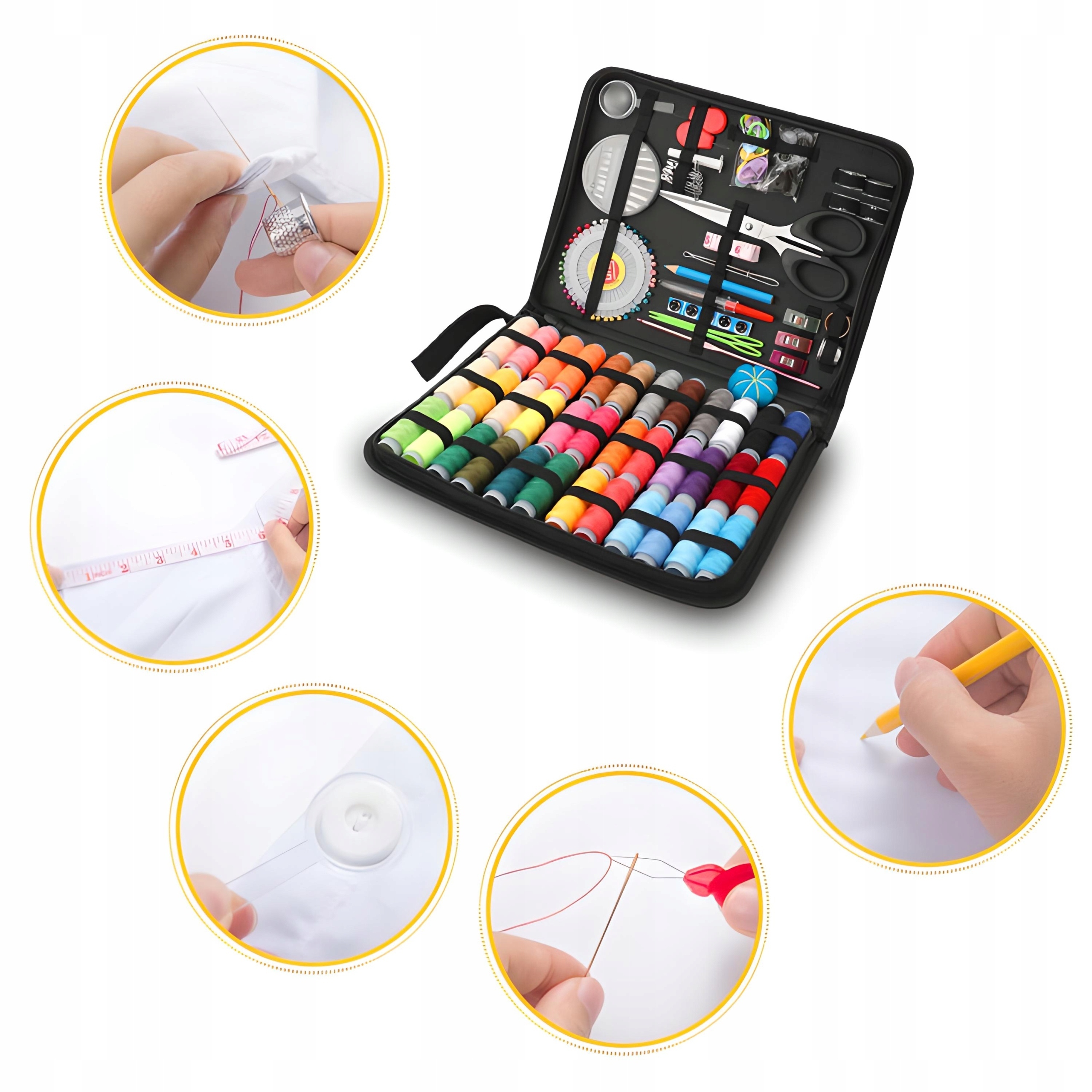 Швейна інструментарія в стильному випадку. Це ідеальний предмет для кравців, а також для людей, які використовують шиття в повсякденний день. Він містить усі основні речі, необхідні для пришивки або відновлення одягу. Справа складається з 226 елементів , серед інших ниток, сантиметра, ножиць, голки або сварки. ви будете зшити з ним, наприклад Кнопки для різного одягу і не тільки.