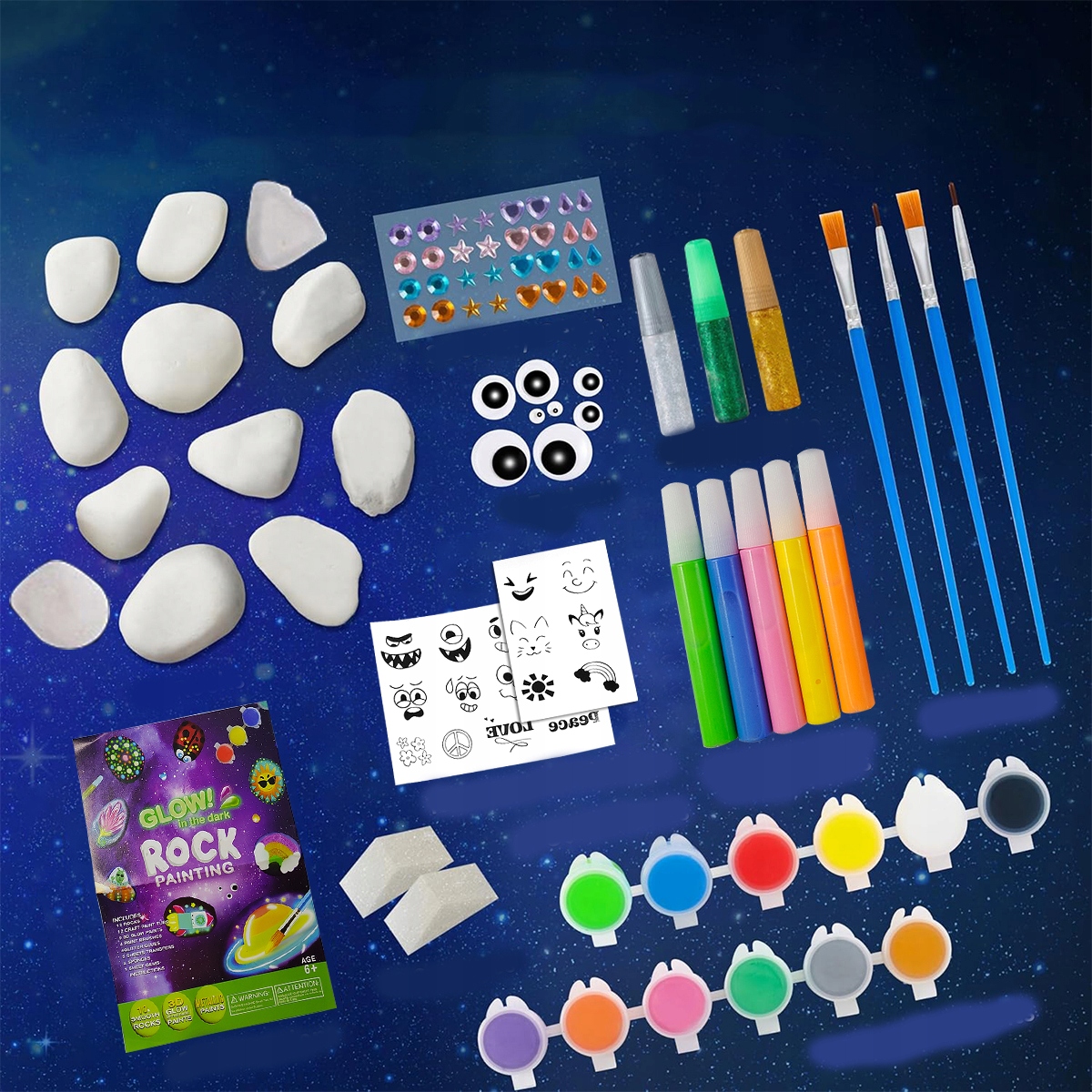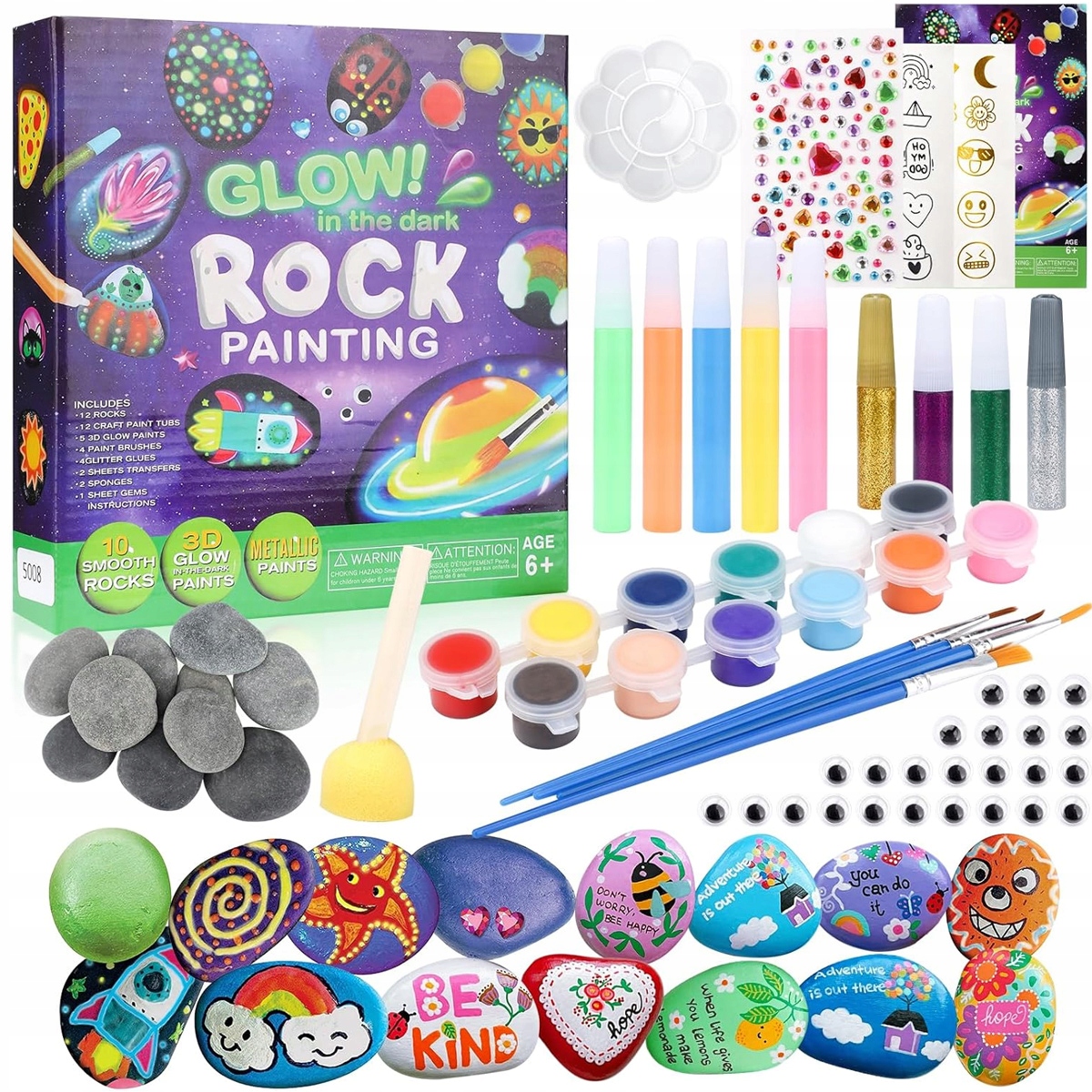 ✅ЯКІСНИЙ набір для малювання по каменю. Цей набір DIY включає 12 каменів, 6 стандартних кольорів, 6 кольорів металік, 5 кольорів, що світяться в темряві, 3 клеї з блискітками, 32 дорогоцінні камені, 8 очних яблук, 18 наклейок, 4 пензлі, 2 губки, 1 інструкцію з експлуатації та 1 барвисту картонну коробку. Рекомендовані уроки образотворчого мистецтва для дівчаток від 6 років.