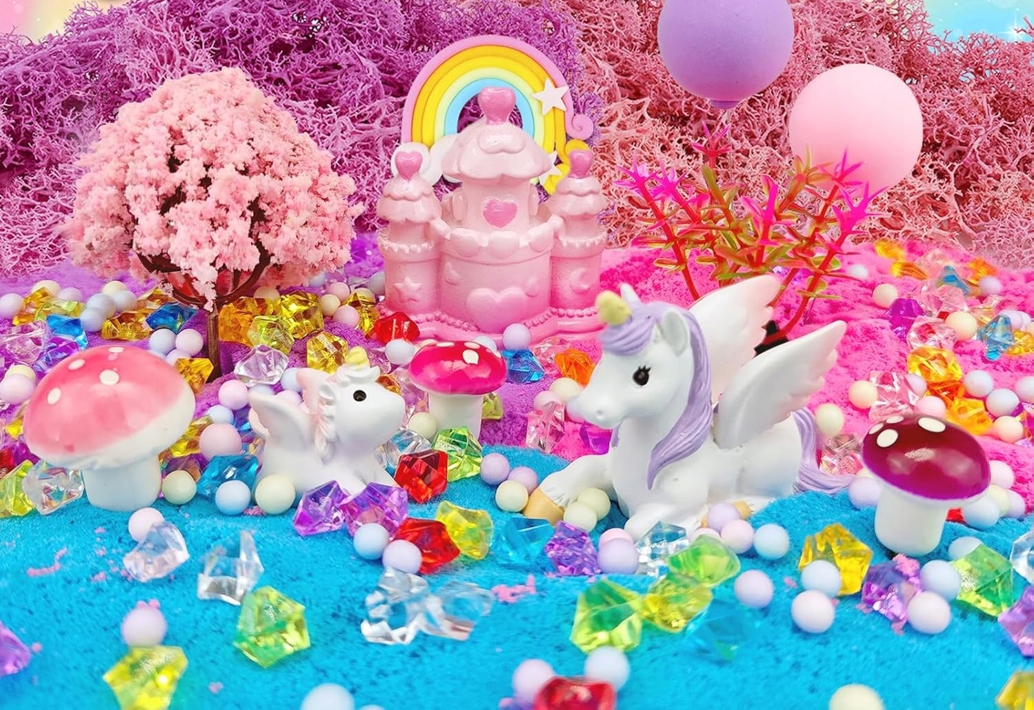 ⭐ Творчі розваги - Набір містить багато різнокольорових елементів - від веселки та дерев, різнокольорового піску та кристалів до чарівного єдинорога та замку. Дитина може самостійно створити казкову декорацію, розвиваючи уяву, творчі здібності та ручну майстерність.
