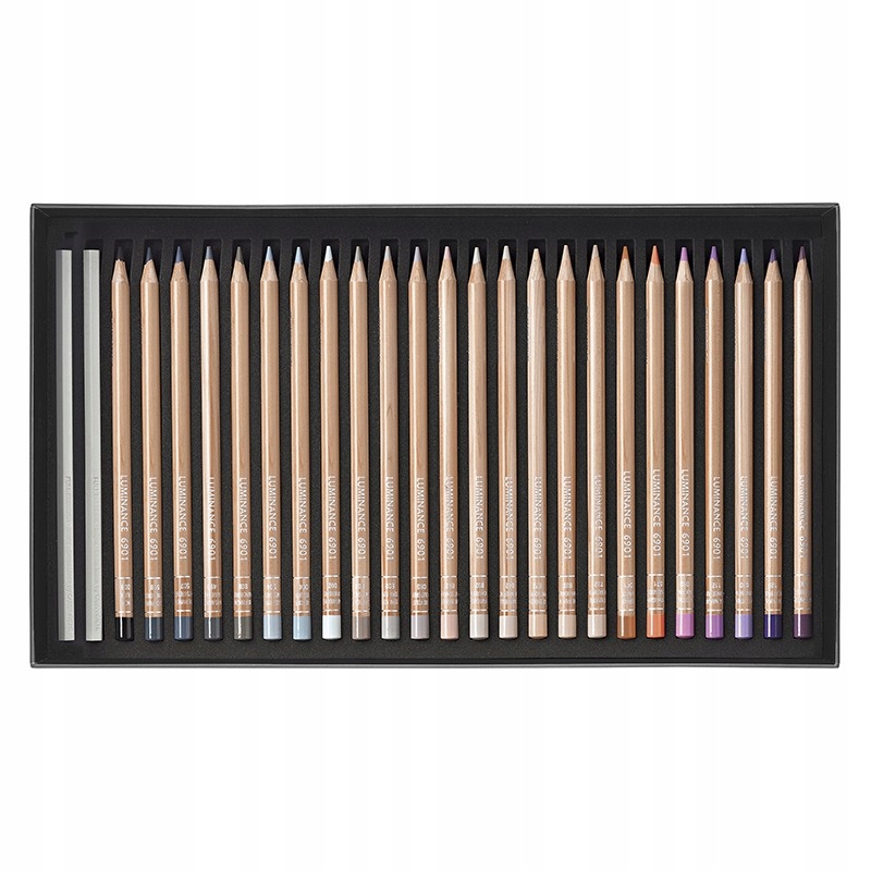 Серцевиною олівця Luminance 6901 є м’який, майже кремовий стрижень із високою концентрацією пігментів, який переносить на папір інтенсивні насичені кольори з дуже високою покривною здатністю. Кольори забезпечують чудову стійкість до води та світла - залежно від діапазону, запропонованого в наборі, це від 80% до 100% найвищого міжнародного стандарту LFI. Серцевина діаметром 3,8 мм поміщена в раму з кедрового дерева, отриманого з повагою до природного середовища. Вони ідеально поєднуються з акварельними олівцями Supracolor®, олівцями Pablo® та продукцією інших брендів. Кожен олівець описується логотипом виробника, серією, номером кольору та назвою.