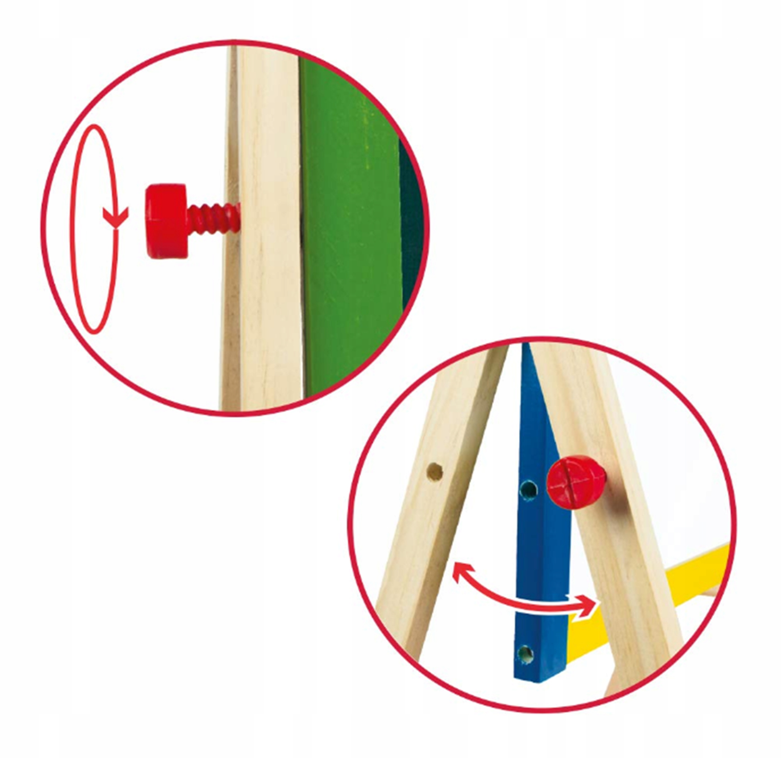 Дошка 2 в 1 — це версія магнітної крейдяної дошки. Дошка має дві поверхні, на яких дитина може малювати, малювати та писати. Дошка повністю виготовлена з дерев'яних елементів