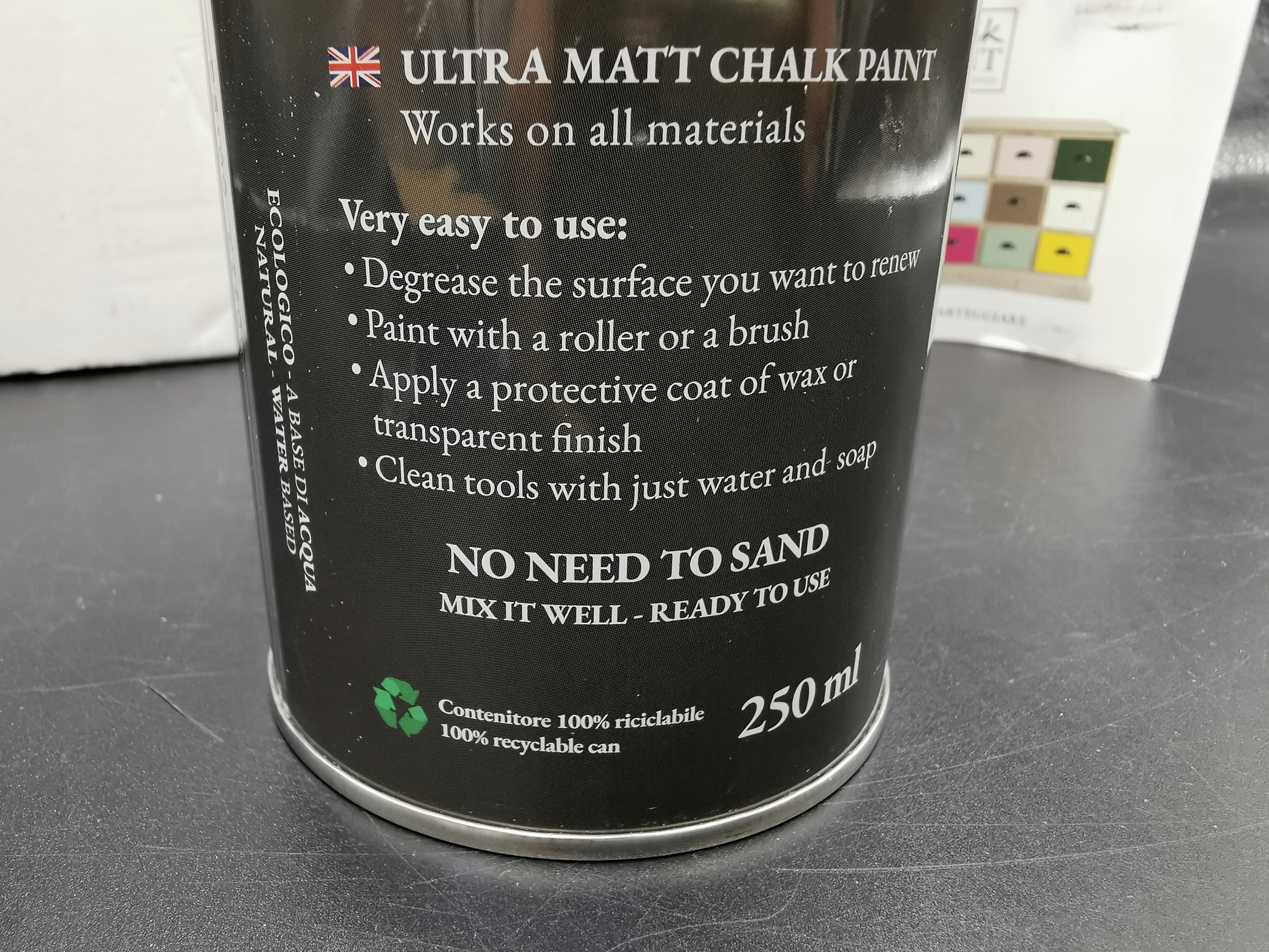- ЕКОЛОГІЧНА - Крейдяна фарба для фарбування меблів і предметів БЕЗ КАРТАЖУ. Не має запаху і підходить для домашнього використання. Нетоксичний продукт для інгаляцій.
