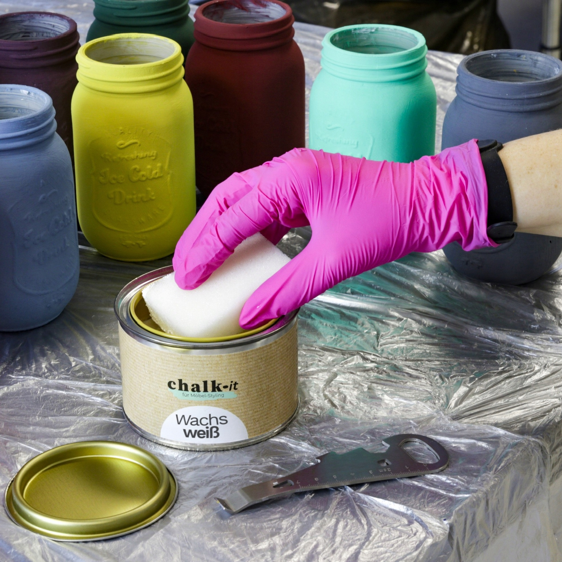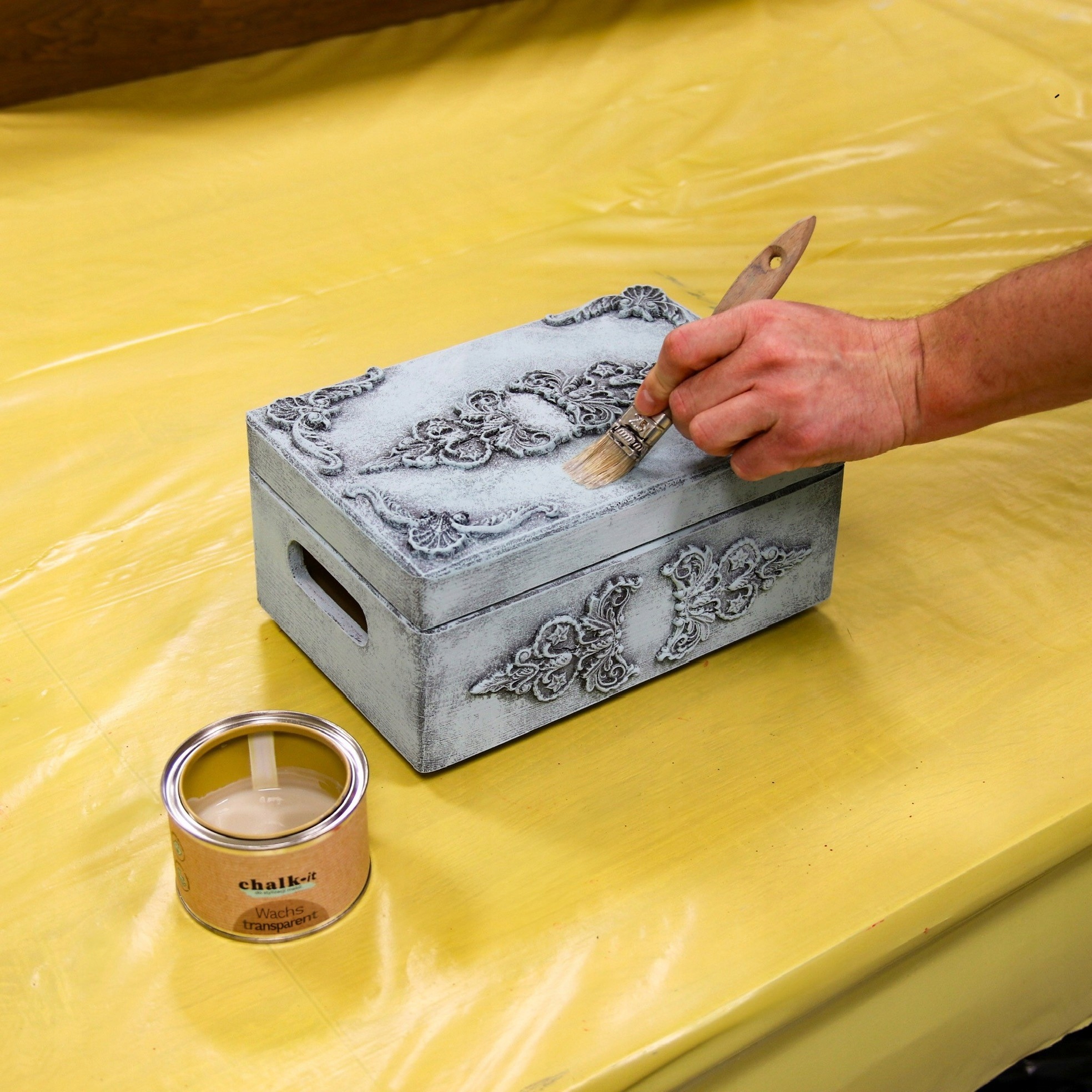 Надайте своїм меблям унікальний вигляд та довгостроковий захист завдяки нашому воску крейди! Це продукт для прикраси та захисту поверхонь, покритих крейдовою крейдовою фарбою (доступний на інших аукціонах у кольорах 125 мл потужності-18 або 750 мл-40 кольорів). Chalk-im Wax складається з природного бджолиного воску та воску Карнауба. Наш віск захищає поверхні від плям і води, поглиблює колір і дає тонкий блиск і оксамитовий, приємне покриття. Віск крейди також можна використовувати для голим деревом. Він доступний у безбарвних, темних, білих та чорних кольорах (інші кольори, доступні на інших аукціонах).