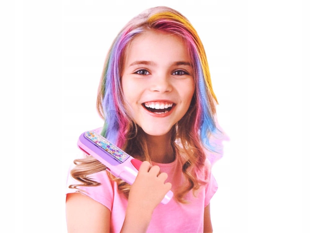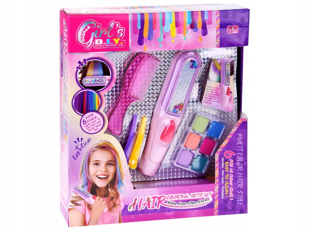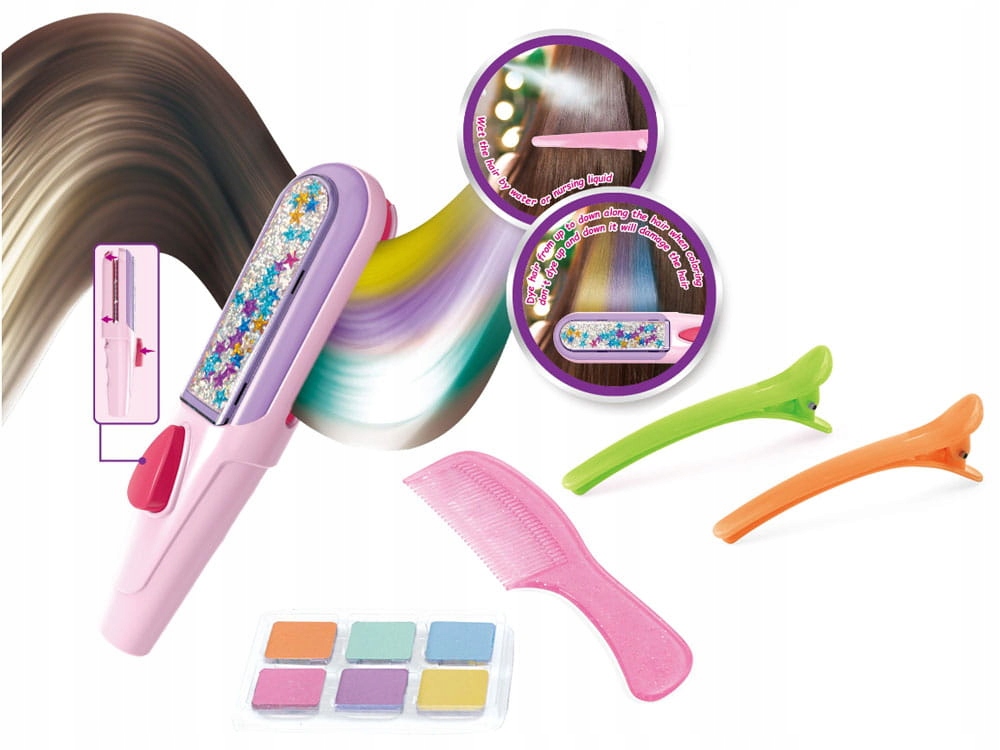 Набір містить усі необхідні аксесуари для створення нової барвистої зачіски. Тут ми знайдемо аж 6 кольорів крейди: фіолетовий, оранжевий, зелений, морський, рожевий, блакитний; а також гребінець і пристрій для нанесення фарби на волосся.