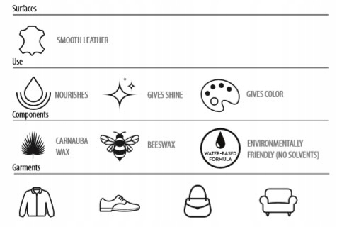 Перед використанням кожен шкіряний виріб перевіряйте на невидимий шматок, щоб перевірити вплив продукту на колір і структуру шкіри.