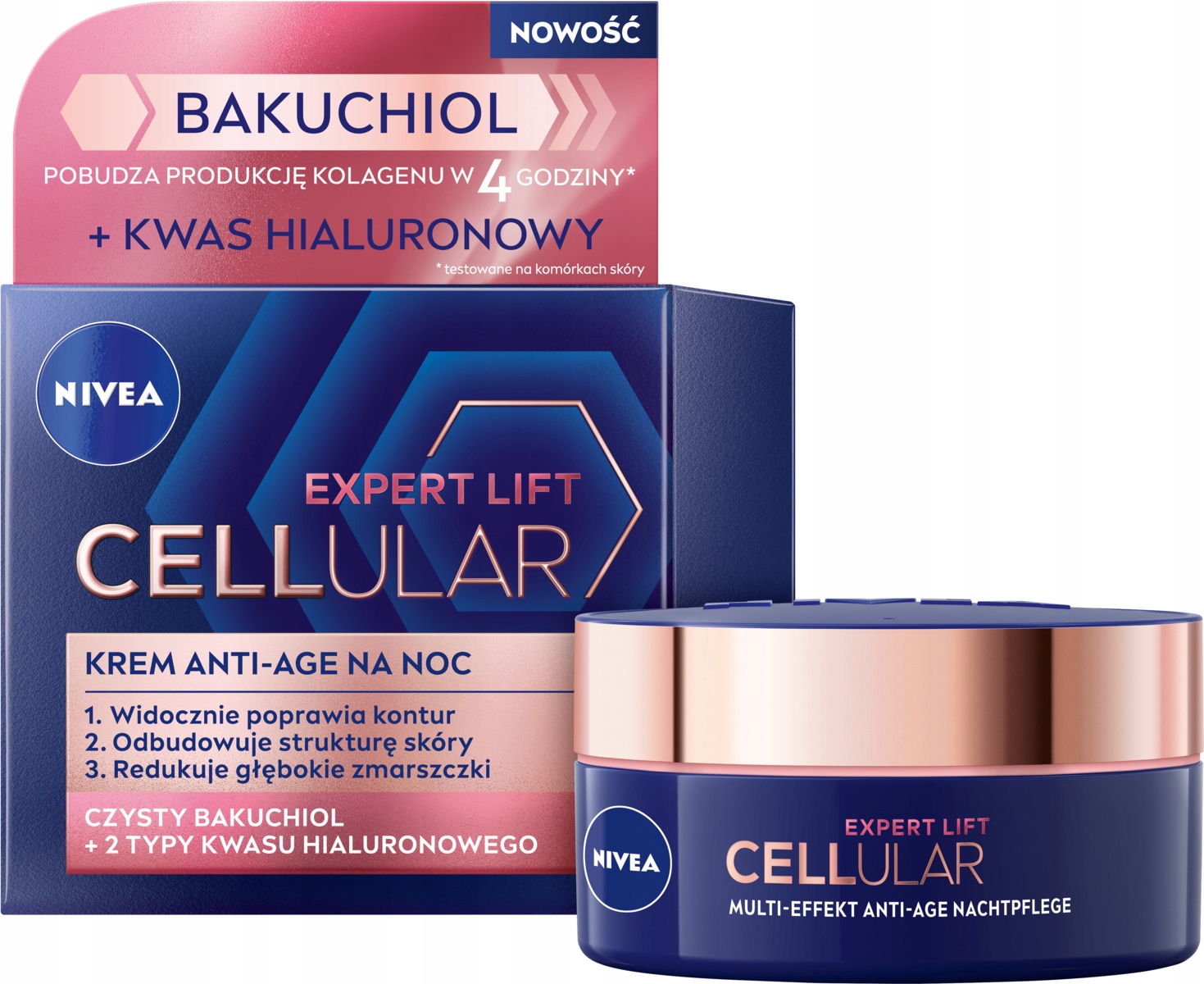 Нічний крем NIVEA Cellular Expert Lift Anti-Age містить комбінацію потужних інгредієнтів, що запобігають старінню, які діють глибоко на клітинному рівні, завдяки чому шкіра виглядає молодшою. Чистий бакухіол, антивіковий активний інгредієнт нового покоління від NIVEA, підтримує процеси, які стимулюють вироблення колагену в клітинах, лише через 4 години після нанесення*. Допомагає відновити щільність шкіри. Мікро- та макромолекулярна гіалуронова кислота, 2 види гіалуронової кислоти, відомі своїми зволожуючими та розгладжувальними властивостями, допомагають зменшити зморшки.