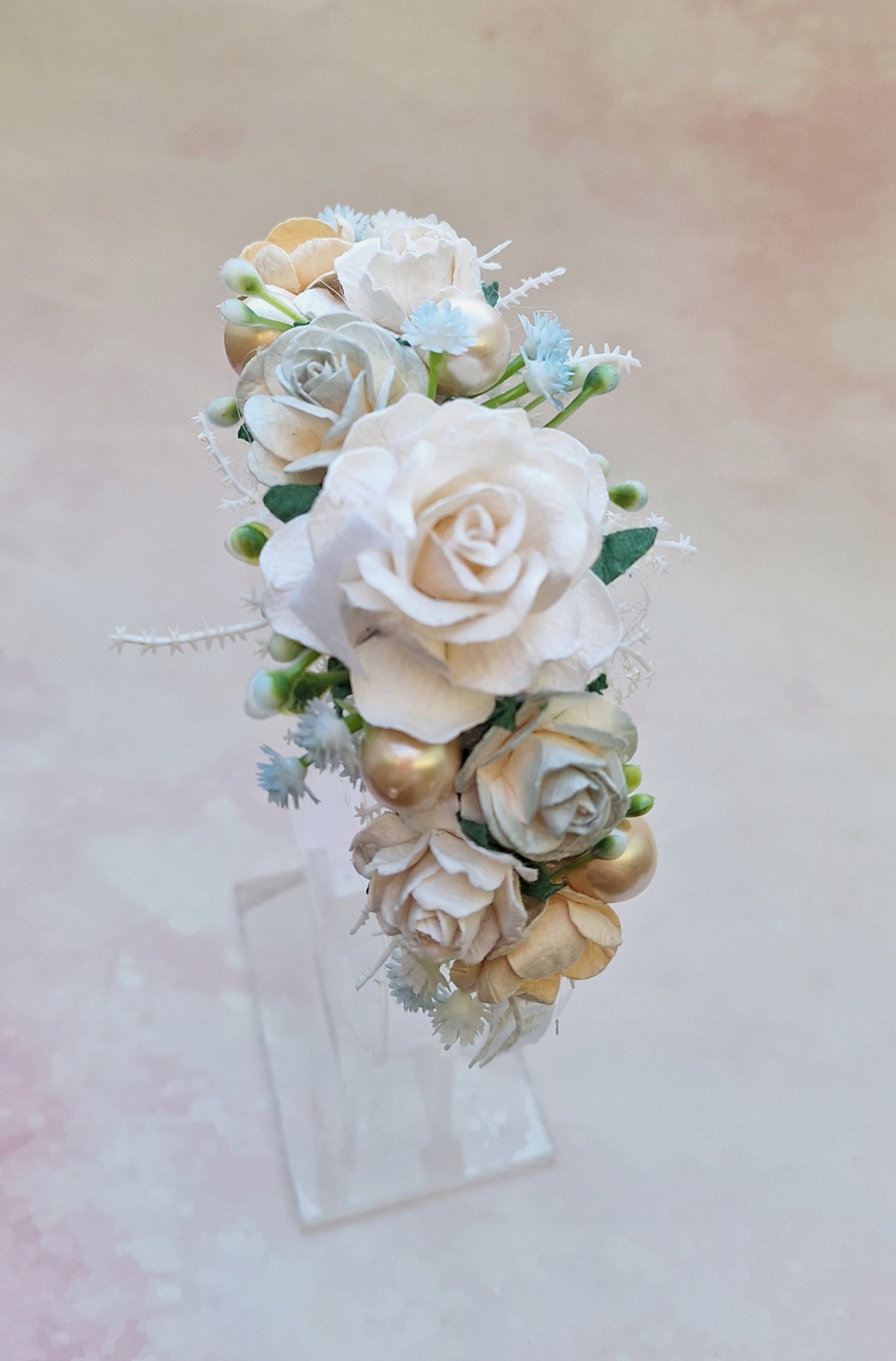 Кремово-блакитна пов'язка для причастя з трояндами до весільної сукні