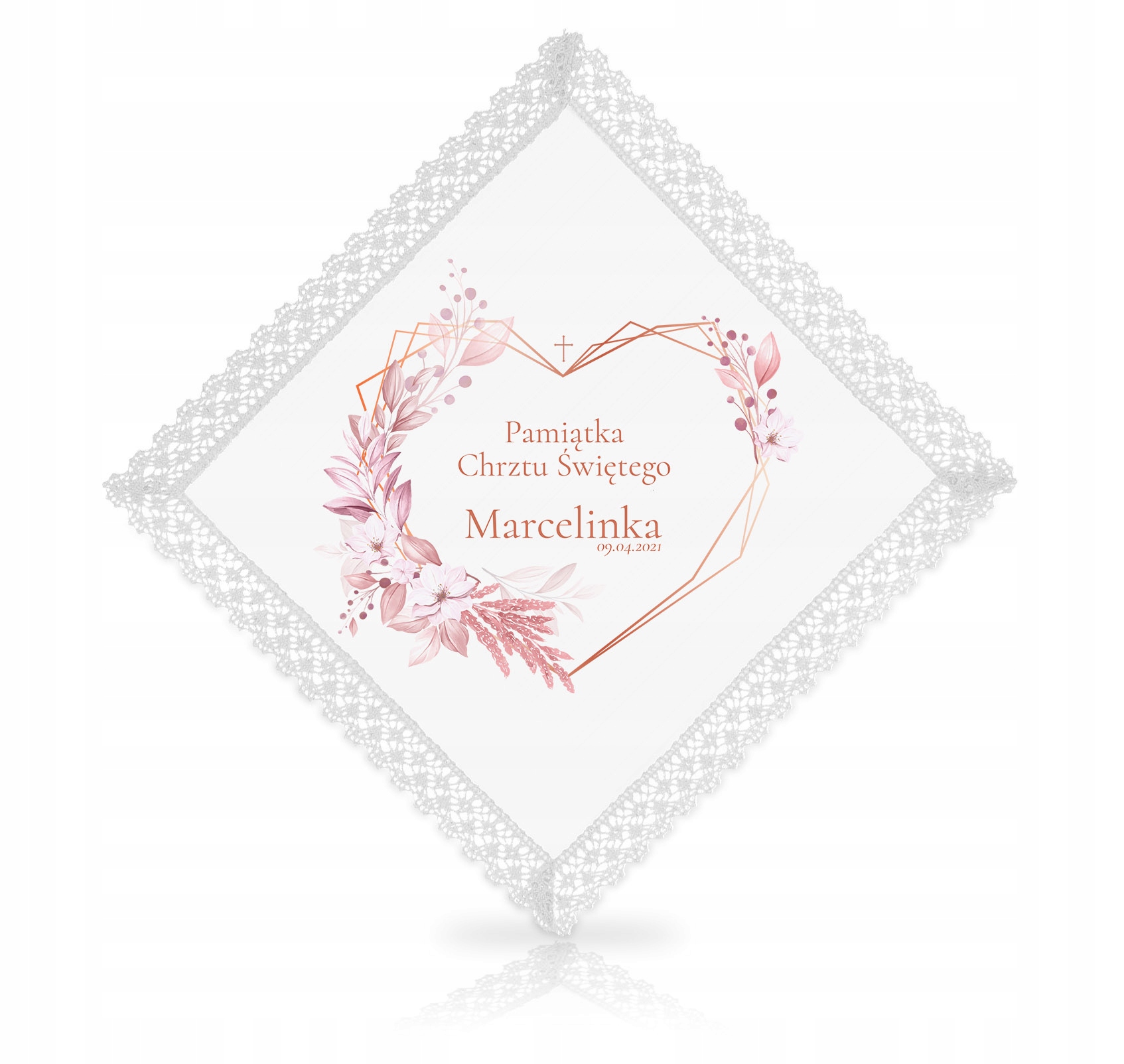 Хрестильне вбрання у вигляді хустки є обов'язковим аксесуар, яким повинна запастися хрещена мати. Прекрасний мотив бавовняногомережива ідеально підходить до імені дитини та дати на одязі.