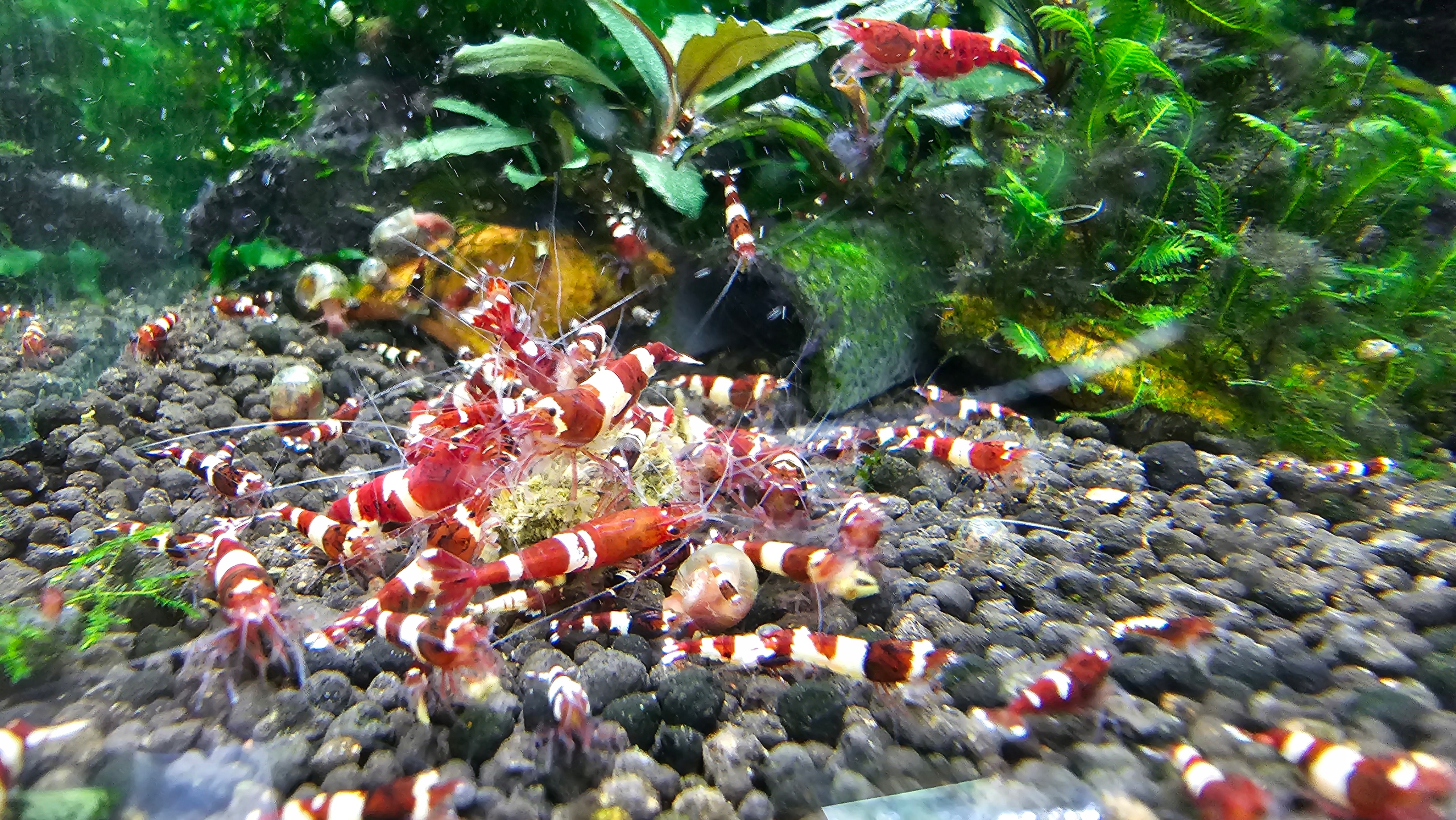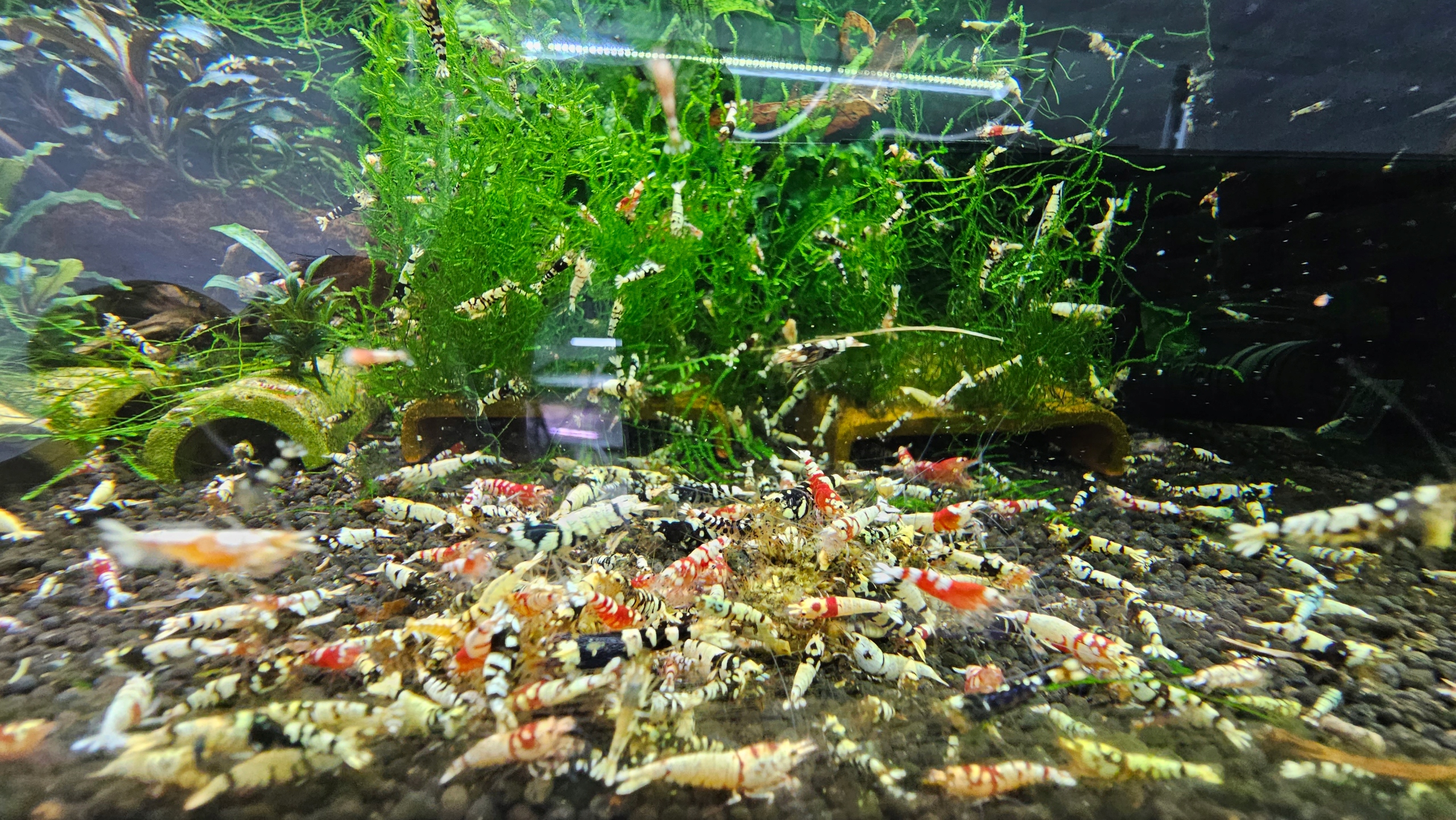 Відмінного розведення матеріал, дуже хороший генофонд. Креветки з плямами пігментації. Ноги мінімально пофарбовані. Розмір приблизно 1-1,5 см. Креветки з акваріума, який не пройшов мій відбір, з акваріумів з Fancy Tigers, виловлені випадково зі зграї на фото нижче. Їх годують їжею домашнього приготування з 50 різних продуктів. Вони здорові, добре їдять їжу і охоче розмножуються :)