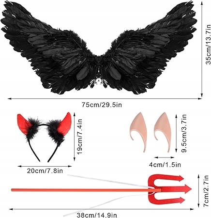 Крила чорного диявола з пір'ям, вилка, роги, маскувальні вуха ельфа