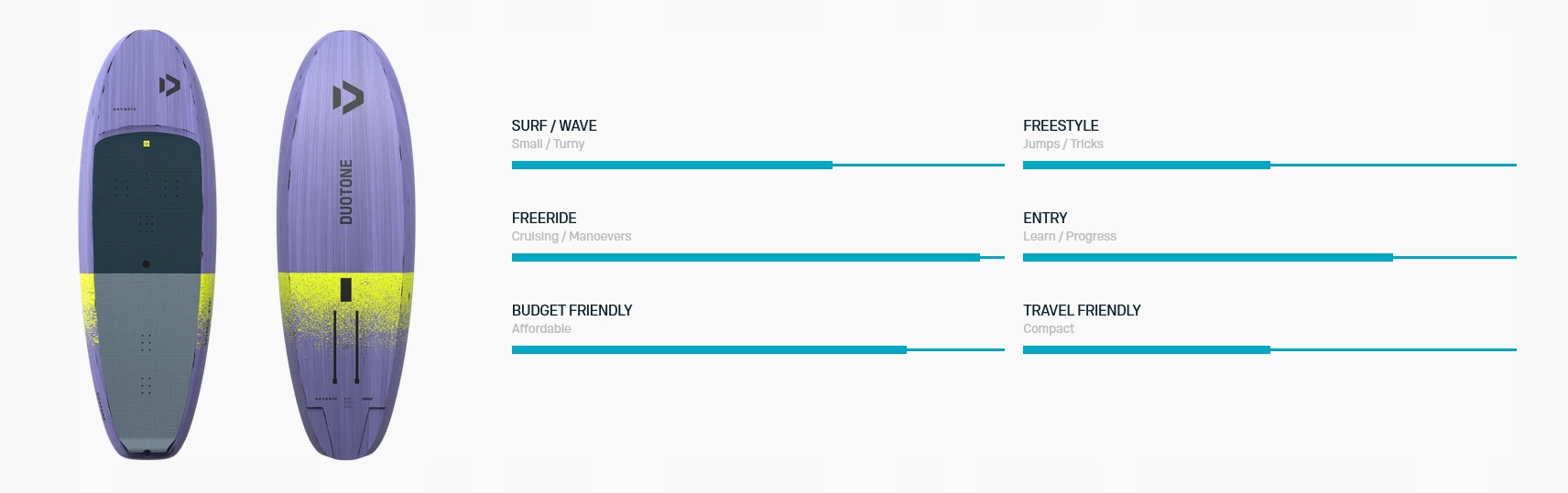 Skybrid забезпечує надзвичайно ефективні старти, стабільні настанови та відмінний слайд - все це в більш компактній та доступній конструкції. Більш вузька і довша форма підвищує ефективність слайда і дозволяє вирватися з води раніше, а спеціальний розріз у хвості полегшує ще на ранній перерві. Вбудована колода забезпечує пряме з'єднання з фольгою, посилення контролю та чутливості.