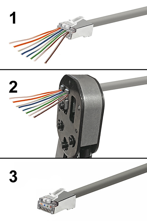 Наскрізні роз'єми RJ не вимагають розрізання жил кабелю перед їх розміщенням у вилці (як у випадку зі стандартними роз'ємами RJ). Це значно спрощує процес правильного розміщення вилки на кабелі - набагато простіше вставити кабель у вилку та уникнути помилок нерівного обрізання проводів. Пропонований обтискач затискає штекер і обрізає стирчачі дроти за одну дію.