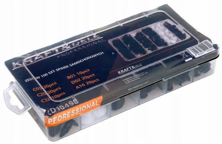 Набір кліпс і кліпс для кріплення оббивки, 100 шт., Kraft&Dele, модель KD10498, виготовлені з матеріалів найвищої якості. Набір складається з 6 найпопулярніших автомобільних затискачів таких брендів, як: BMW, Audi, Lexus, Mercedes, Opel, Skoda, Toyota тощо.
