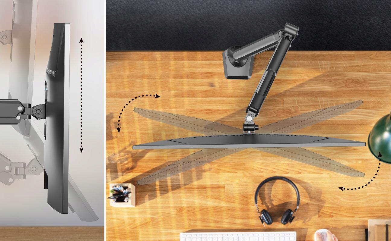 Тримач ONKRON G90-B надає широкий діапазон налаштувань: нахил монітора від -90° до +45°, горизонтальне обертання на 180° та обертання на 360°. Регулювання по висоті в діапазоні 195-445 мм і висоті до 550 мм дозволяють підлаштувати положення екрану в будь-якій ситуації. Це полегшує настільний тримач для роботи, навчання та використання комп’ютера для розваг чи ігор.