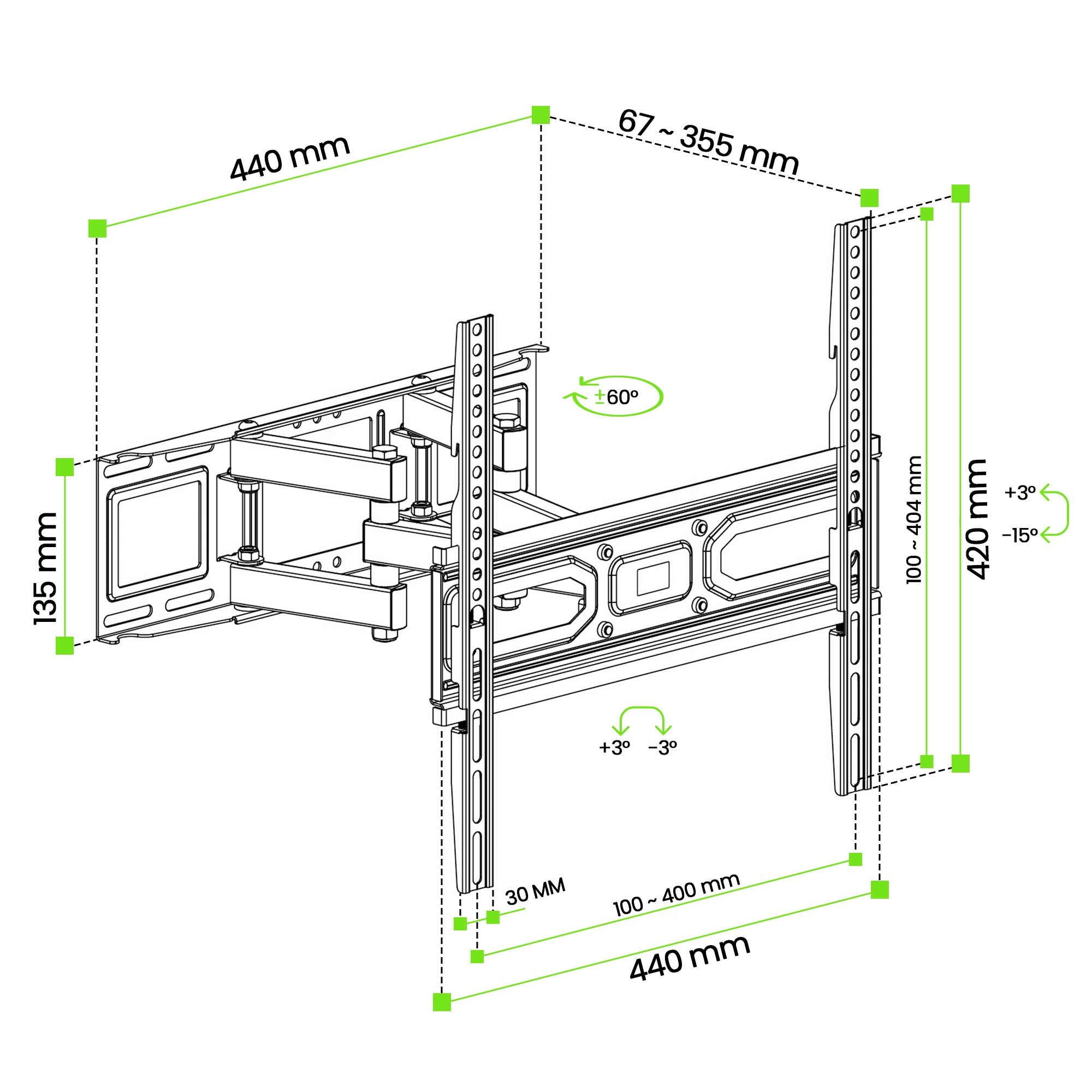 Кріплення для телевізора забезпечує плавне регулювання, тобто кут нахилу від 3° до -15°, поворот від -60° до +60° та регульовану відстань від стіни від 67 до 355 мм.