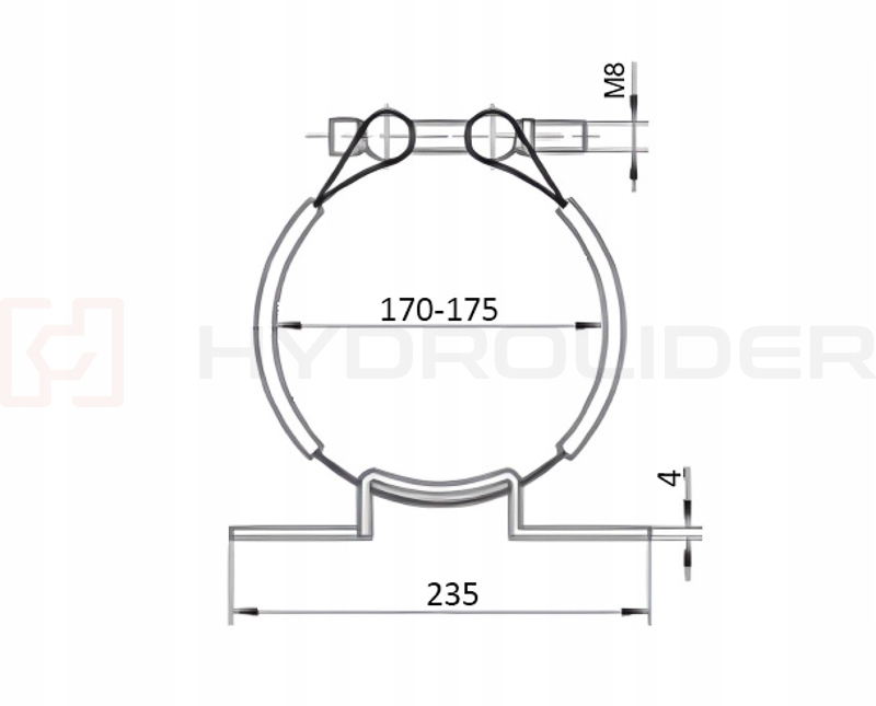 Хомутик кріпить і зменшує вібрацію на гідроакумуляторе. Підходить для гідроакумуляторів об’ємом 3 л і 4 л з нашої пропозиції та інших діаметром від 170 мм до 175 мм.