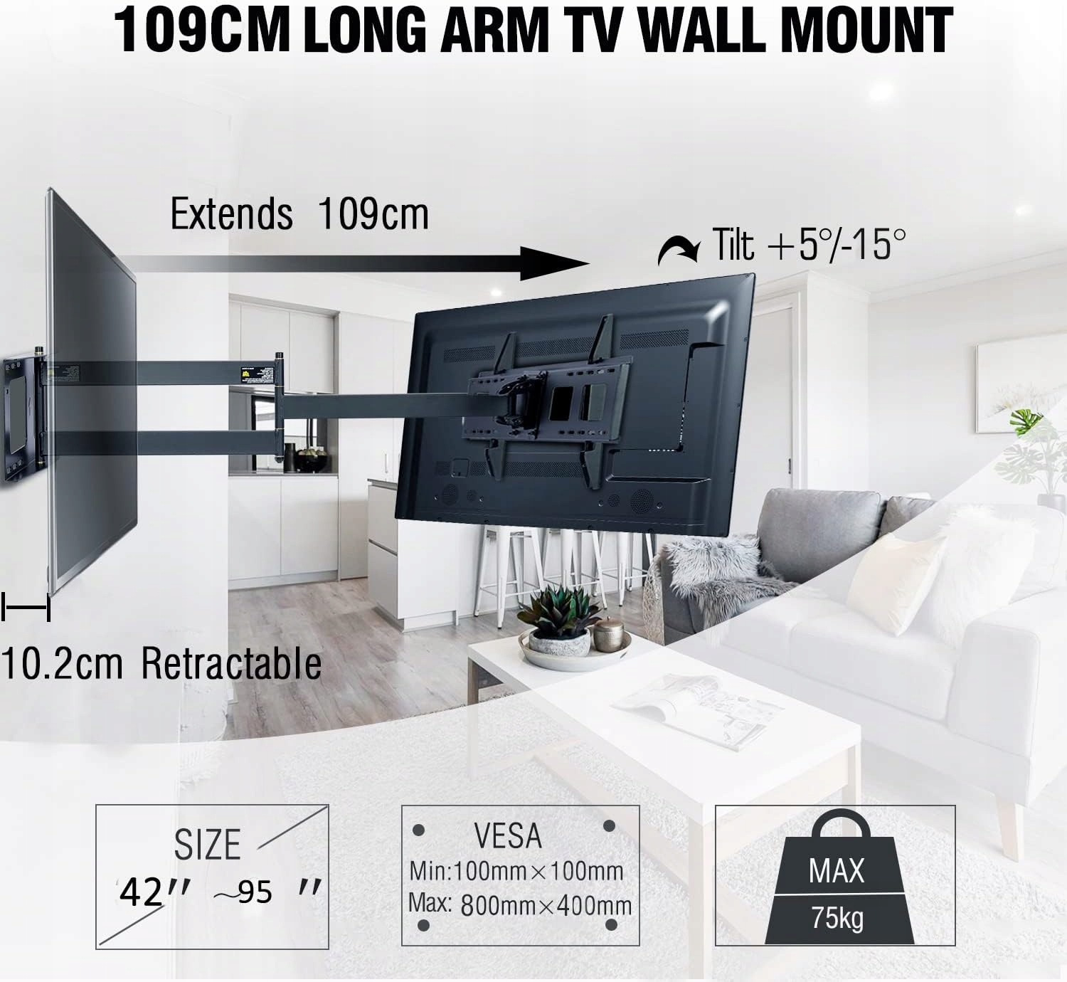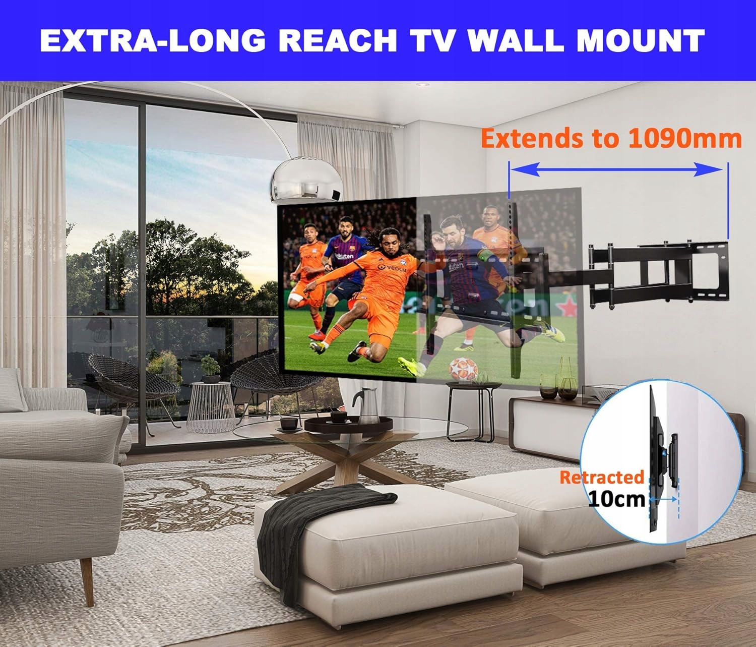 - Цей наддовгий кронштейн для телевізора ідеально підходить для вирішення проблем із видимістю завдяки шарнірному подовжувачу 1090 мм. Забезпечує максимальну універсальність і легкість маневреності. Кронштейн простягається на 109 см від стіни, розширюючи точки огляду під різними кутами в кількох кімнатах.