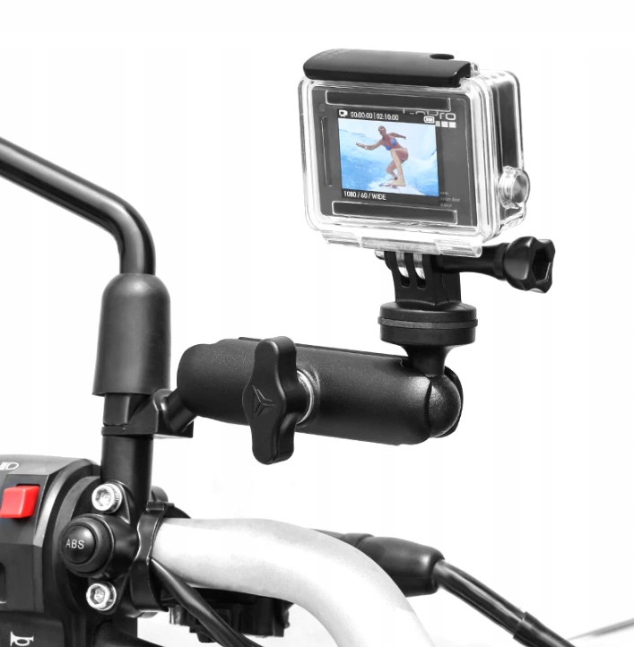 Кріпка для мотоцикла/велосипеда, що дозволяє розмістити спортивну камеру чи інше фотообладнання на дзеркальній різьбі чи іншому гвинті. Кріплення GoPro підходить для більшості спортивних камер, а гвинт з універсальною різьбою 1/4" підходить для камер, тримачів для телефонів і фотоаксесуарів