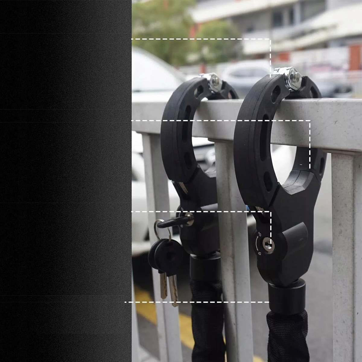Замок для електричного скутера виготовлений з міцної леплової сталі з товстою ланцюгом високої довжини, стійким до різання, розриву, пиляння та ножиць. Замки для велосипедних ланцюгів можуть запобігти крадіжці у повсякденному використанні.