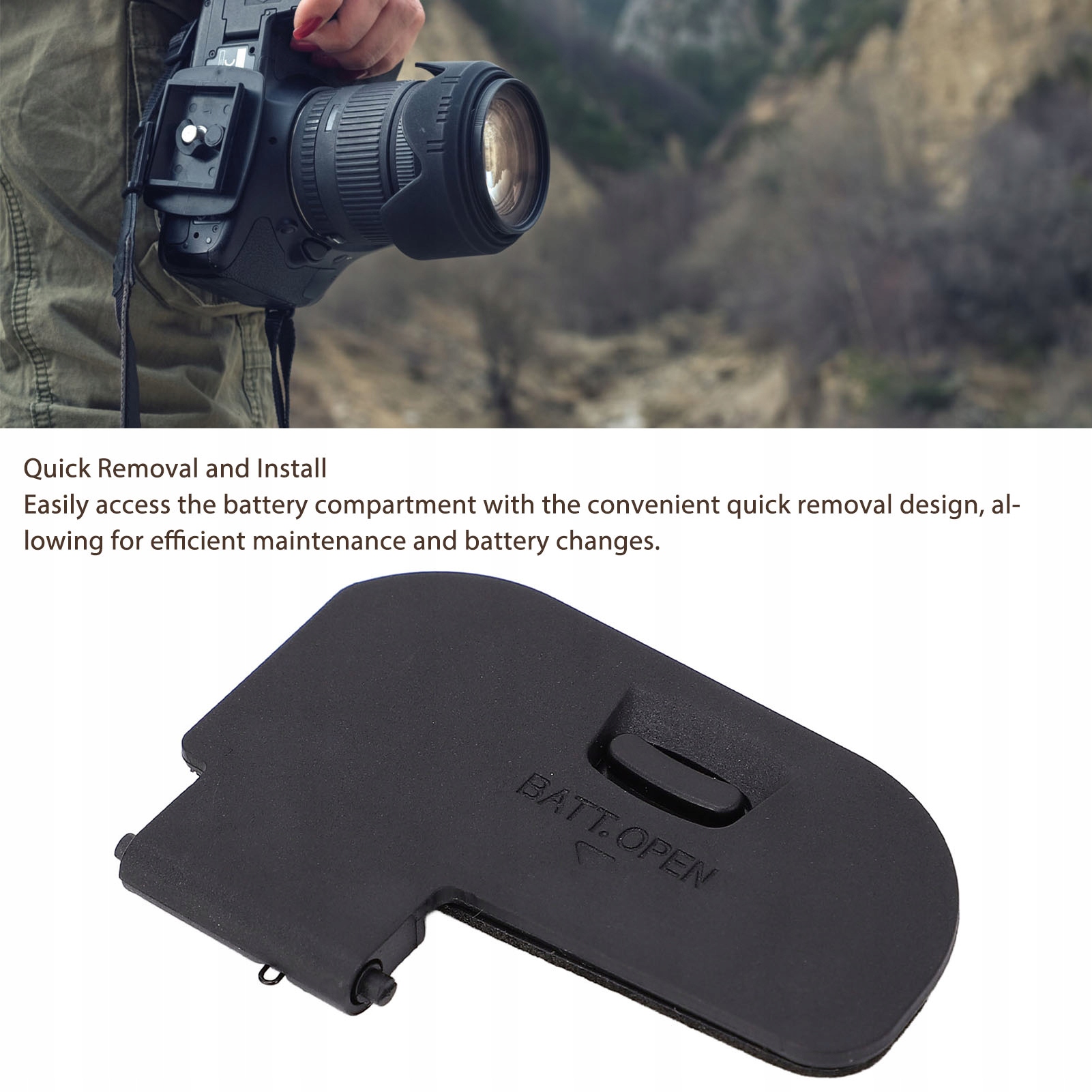 4. Компактність і легкість. Завдяки компактному розміру ця змінна кришка кришки батарейного відсіку є легкою та легкою для транспортування, забезпечуючи портативність без додаткового об’єму налаштування вашої камери.