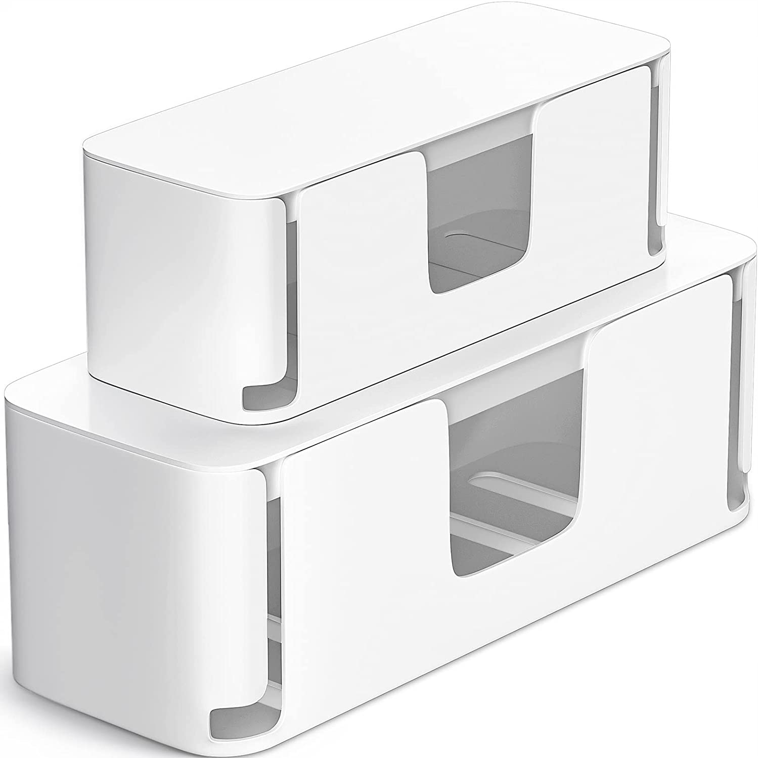 - 2 комплекти кабельних приставок: Ви отримаєте 1 велику коробку та 1 коробку середнього розміру. Задовольнить вашу потребу приховати розетки кількох розмірів. Великий 40 см (Д) x 14 см (Ш) x 12 см (В), підходить для 12 розеток; середній 30 см (Д) x 14 см (Ш) x 13 см (В), підходить для 6-8 розеток. Подовжувач живлення та зарядні пристрої не входять до комплекту.