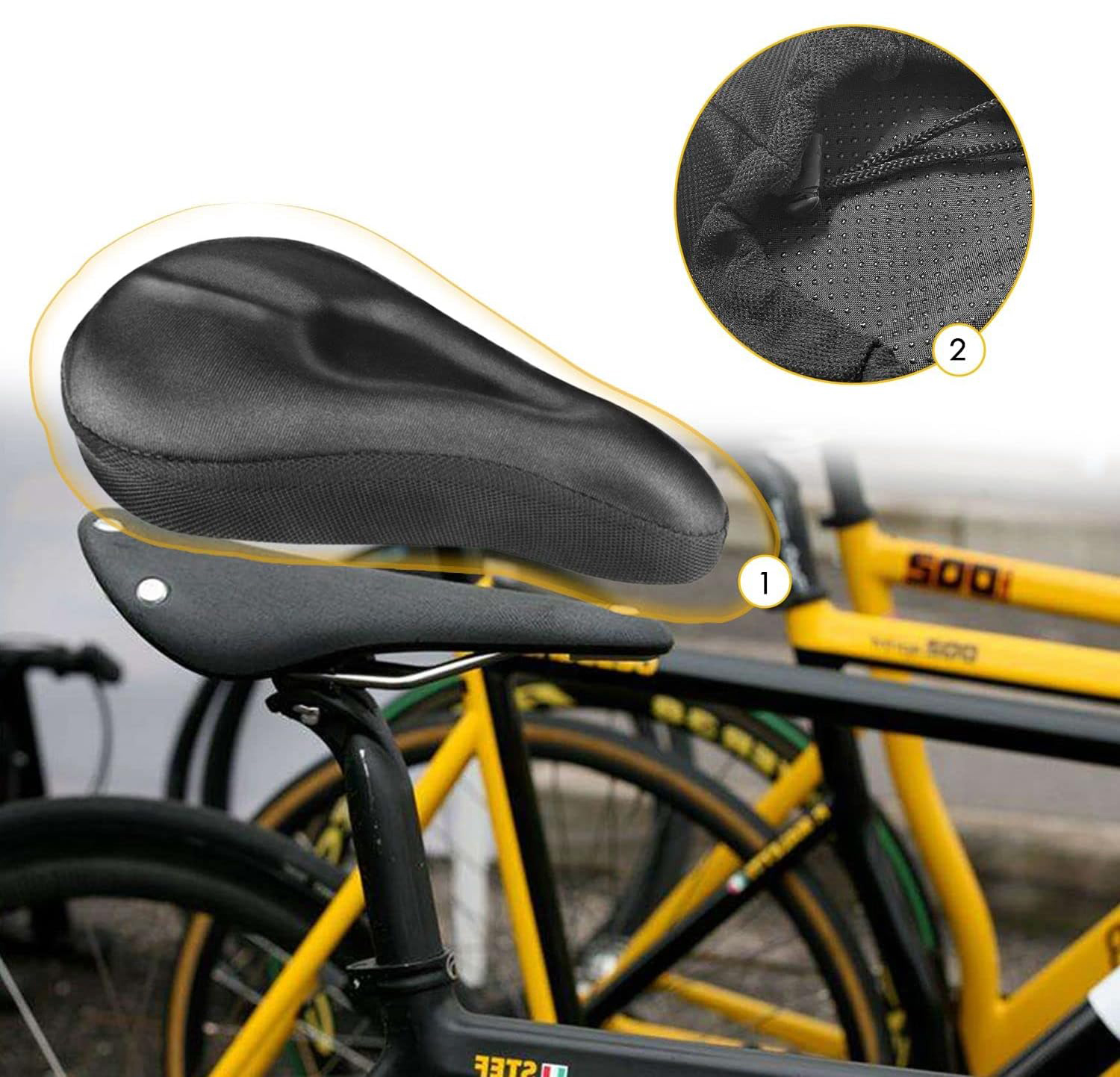 Це гель -сідло - 27 см х 19 см. Підходить до більшості велосипедних сідла! Додаткова водонепроникна та пилова кришка для сідла захищає сідло від води та пилу в дощові дні та на запилених дорогах.