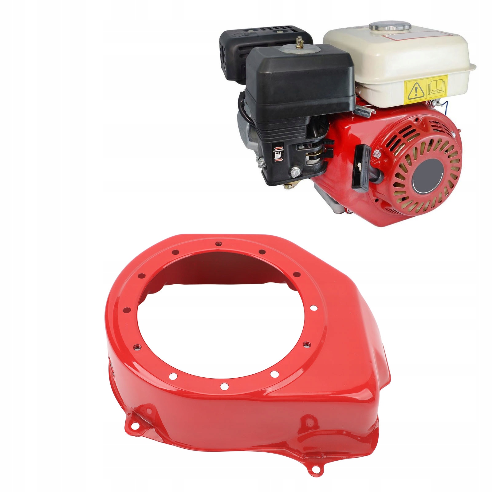 Функція:1. Відповідна модель: Кришка поворотного колеса вентилятора Стартова кришка є заміною для двигунів GX160 5.5HP GX200 6.5HP, будь ласка, перевірте модель двигуна перед замовленням.