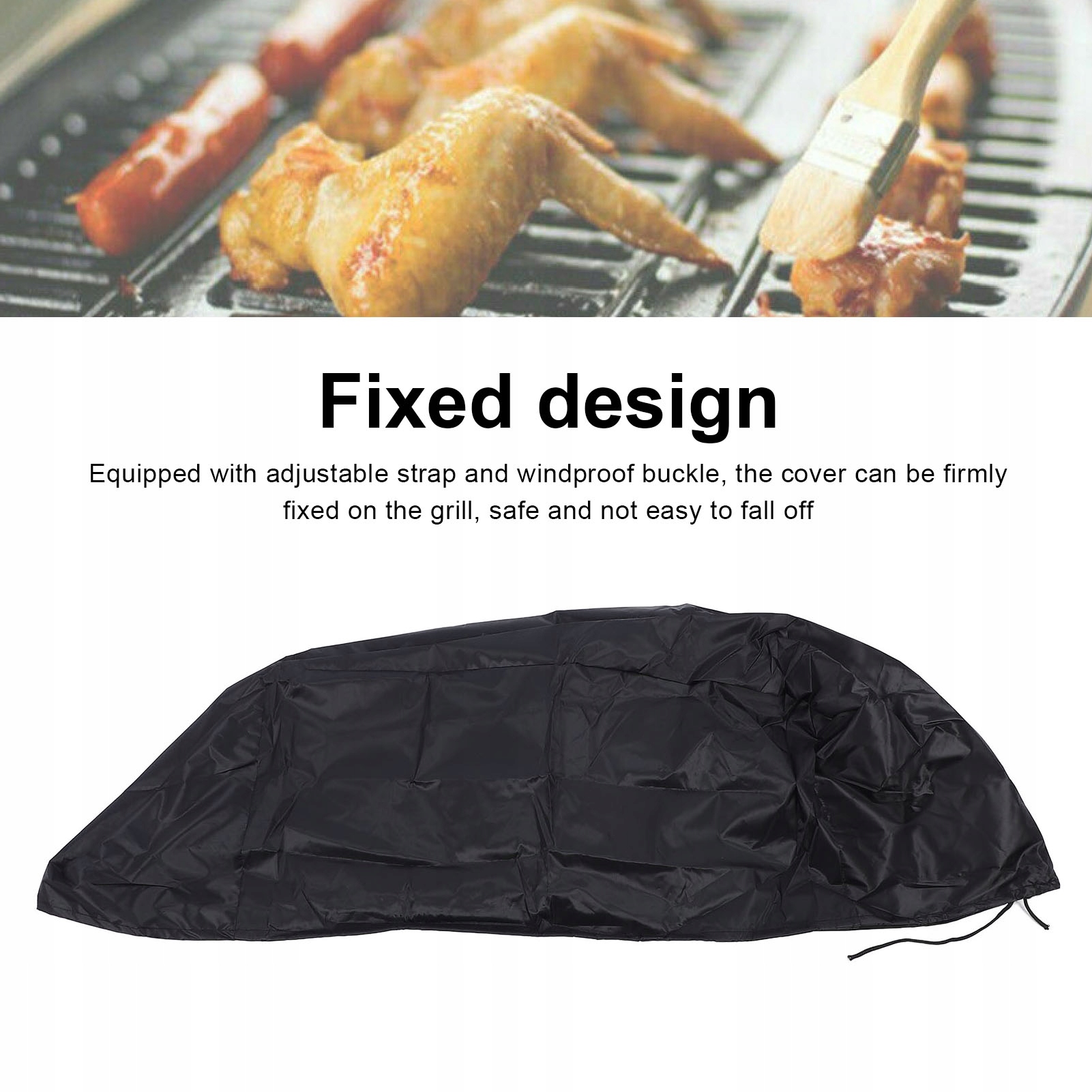 4. Безпечна конструкція фіксації: оснащена регульованим ремінцем та вітряною пряжкою, кришка газової гриль може бути сильно захищена грилем. Ця функція гарантує, що покриття залишається на місці під час сильних вітрів або складних погодних умов, пропонуючи спокій.