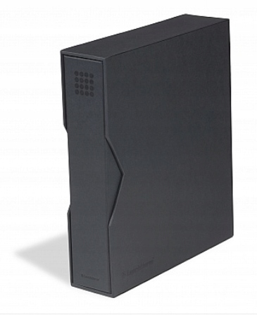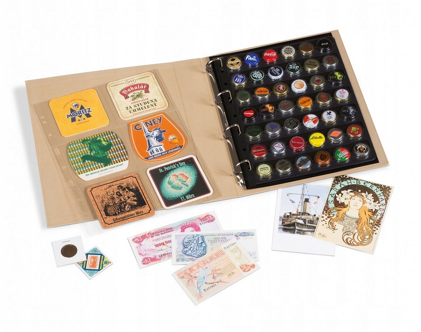 Обкладинка Optima - PUR містить механізм із чотирма кільцями, який вміщує до 60 карток для марок, банкнот (залежно від їх вмісту) або близько 15 для монет.