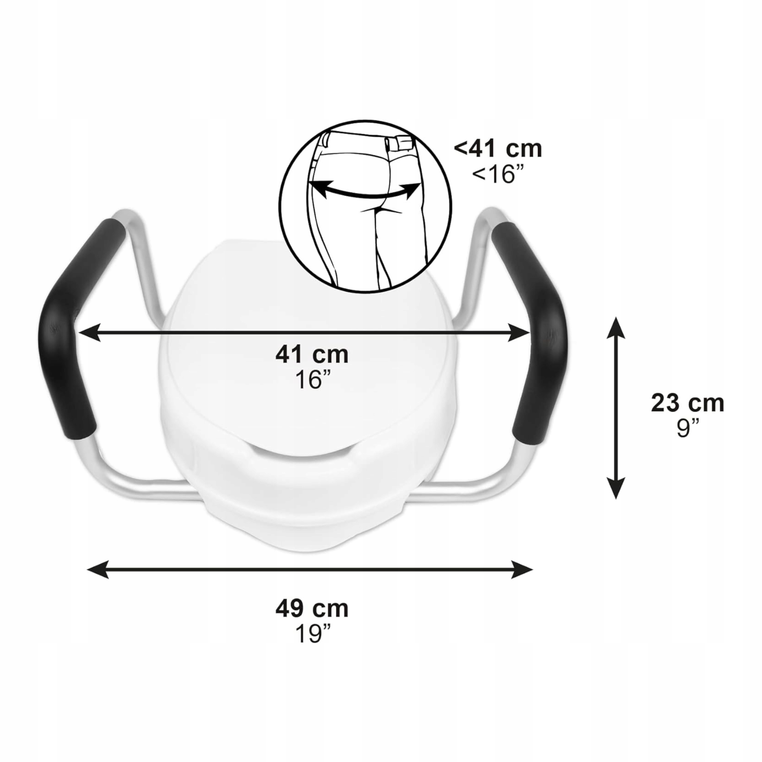 Кришка збільшує висоту унітазу на 4 дюйми (приблизно 10 см), мінімізуючи зусилля і навантаження на суглоби. Він універсальний - підходить як для круглих, так і для подовжених унітазів (довжиною до 15 дюймів/38 см).