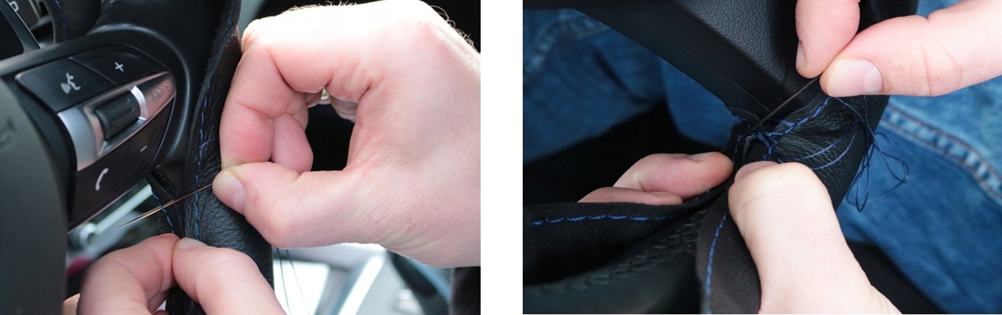 3. Ми пришиваємо кермо, переплітаючи нитку через кожен другий стібок, роблячи S-подібні рухи. Пам’ятайте, що ми лише зачіпляємо нитку, а не проколюємо шкіру.