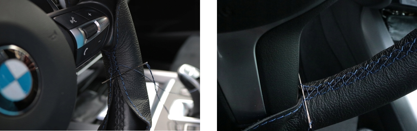 1. Помістіть чохол на кермо так, щоб шкіряний шарнір знаходився внизу та посередині керма. Чохол шиється від плеча до плеча, спочатку відміряйте відповідну довжину нитки, що входить в комплект. Вона приблизно вдвічі довша за ділянку, яку потрібно зшити, тобто від плеча до плеча.