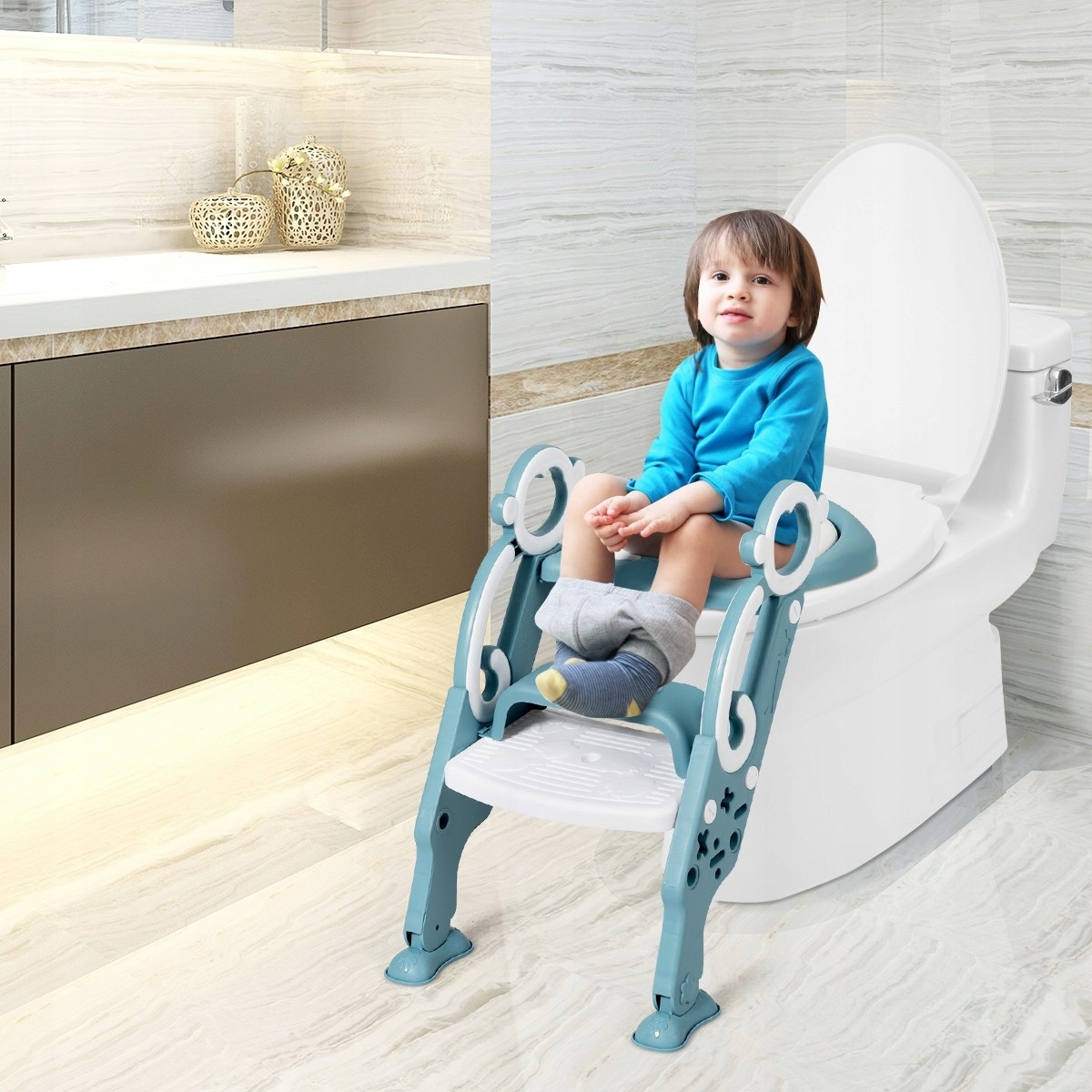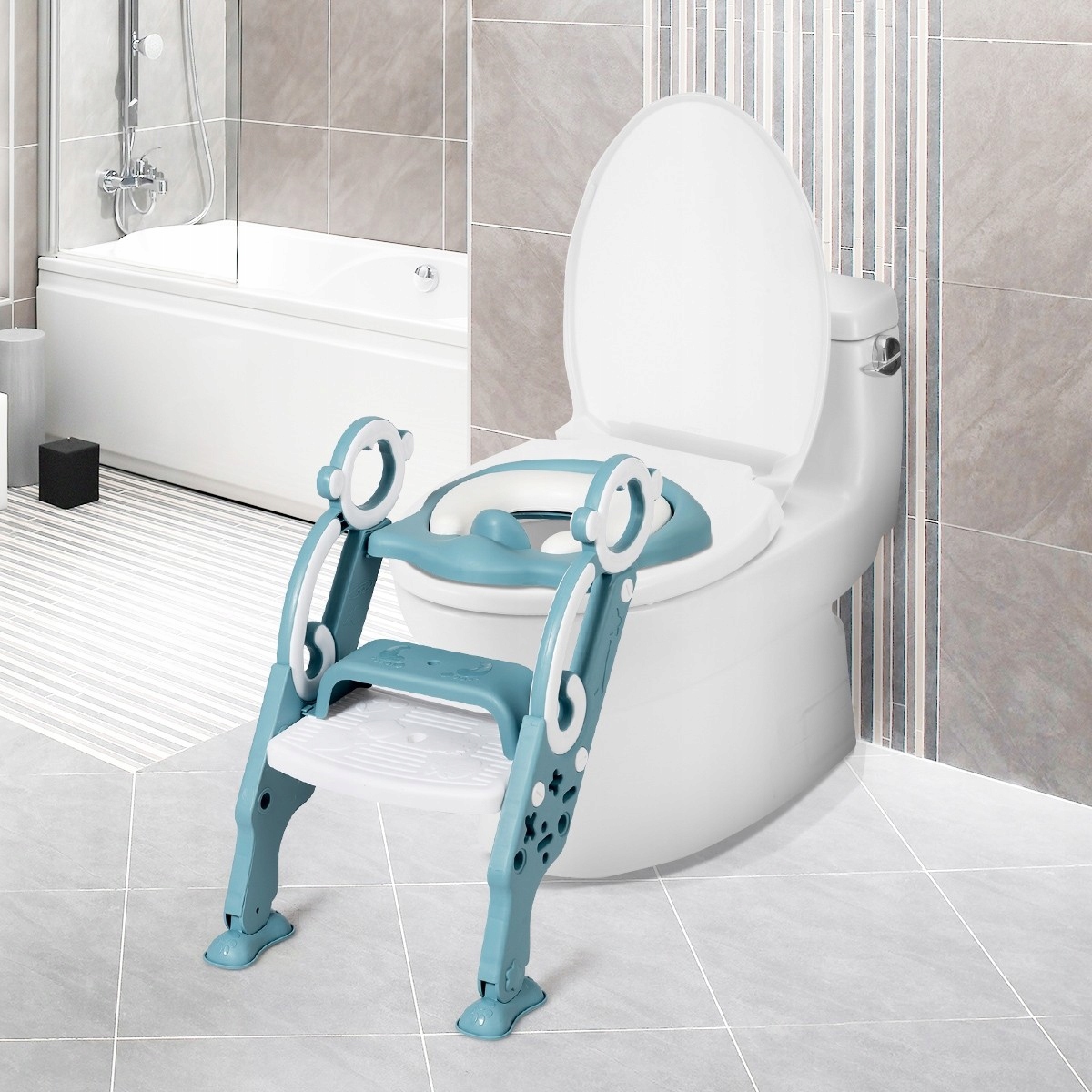 Регульована підставка для ніг: кут підставки для ніг можна регулювати для розміщення туалетів різної висоти. Вона має 2 регульовані висоти, щоб адаптувати драбину до росту дитини.