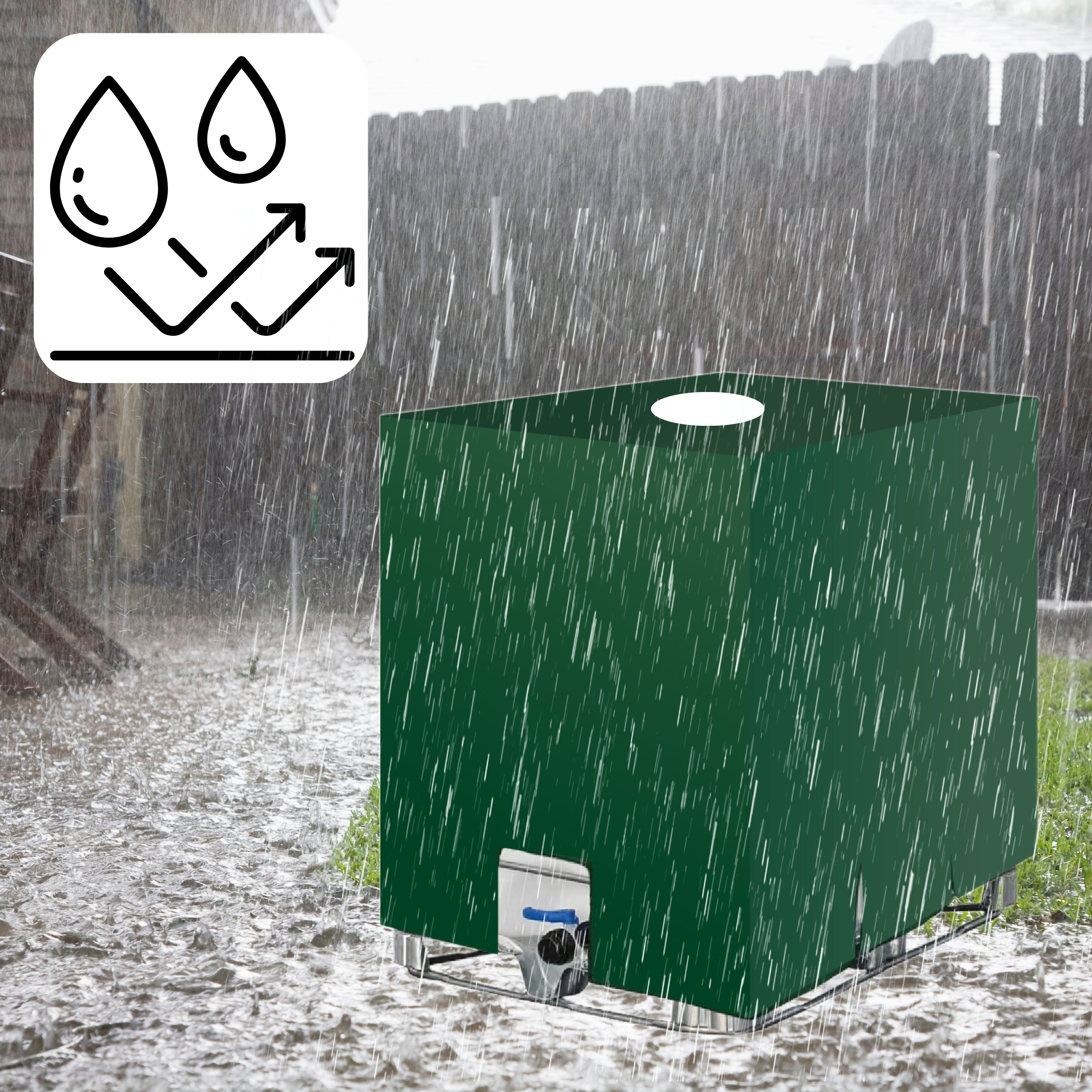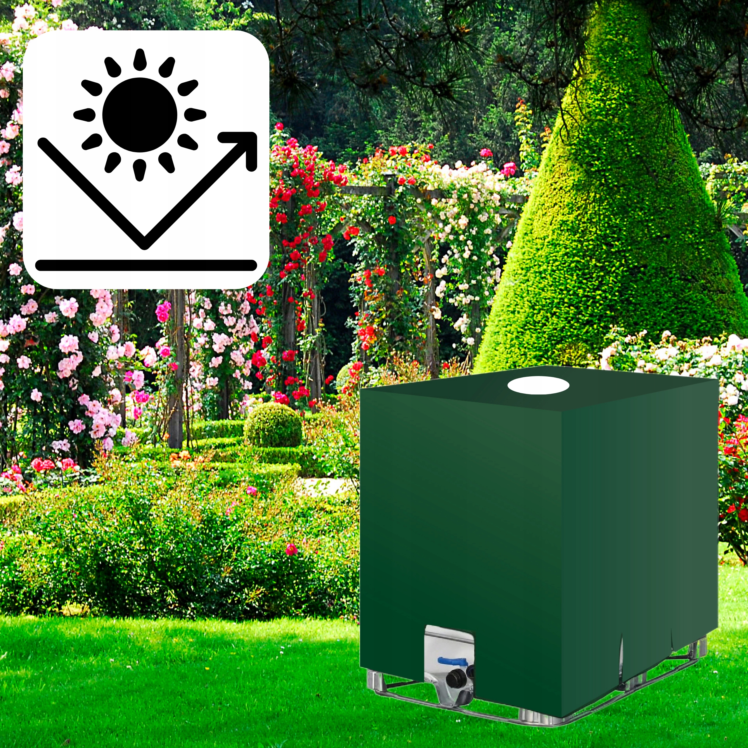 Обкладинка виготовлена з матеріалу стійкого до УФ -випромінювання , що забезпечує захист резервуарів дощової води з потужністю 1000L (розміри 120x100x116 (розміри 120x100x116 (розміри 120x100x116 cm) проти знарядь. Також захищає вміст проти пилу, бруду та інших забруднення, зберігаючи воду чистою протягом тривалого часу.